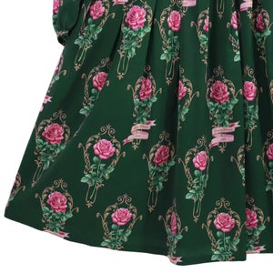 The large pearls and rose lace adorning the chest add a lovely touch.