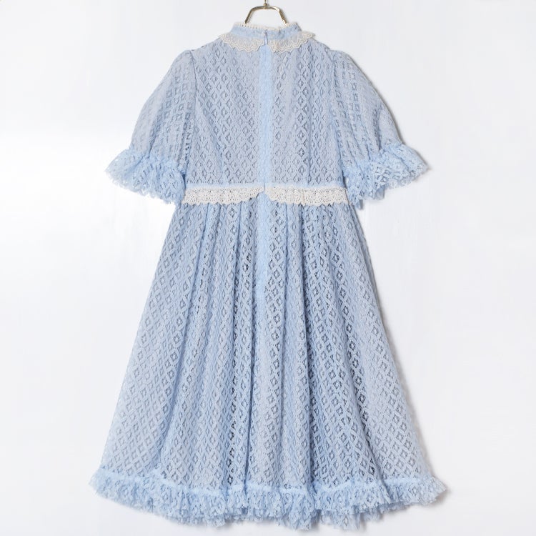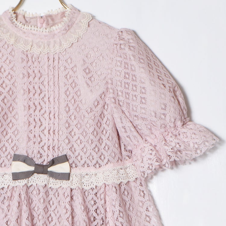 ダイヤのレースが不思議の国のアリスを連想させるドレス。フリルやタック・レースを贅沢に使用した1枚。オンラインショップでは限定カラーのピンクを展開。子供過ぎない落ち着いたカラーが大人可愛いアイテム。