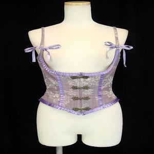 Colors: BABY PINK、PURPLE Material: Outer: 40% Tetoron + 30% cotton + 30% rayon Other: 100% cotton Tape : 100% polyester Pleat tape : 100% polyester Ribbon: 100% Polyester Metal hooks, Metal boning Center length: 21.5cm Shoulder strap width 1cm