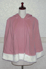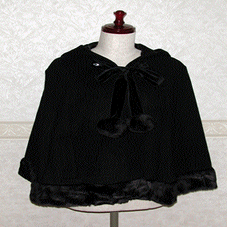 [Design notes] Fully lined. The velvet ribbon attaches with buttons and is removable. There are two openings so you can put your hands out of the cape (they look like pockets).