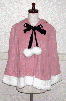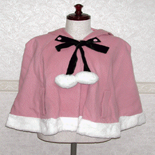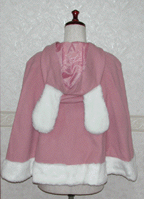 「Heart E」が普通にケープを作ってもつまらないので、フードにうさ耳を付けました。ファーの別珍リボンは取り外し出来ますので、脱ぐ時に縛ったまま片側だけ外せば、つぎに着る時もラクチンです。