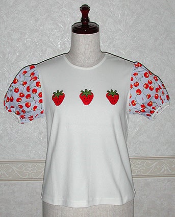 とてもキュートな苺が3つ並んだアップリケにオリジナルのチェリー柄のパフ袖を組み合わせました。色欠け&残りわずかのため、処分価格での登場です!! お早めに御注文くださいね!!
