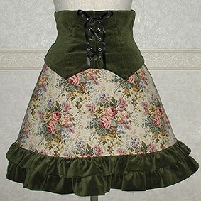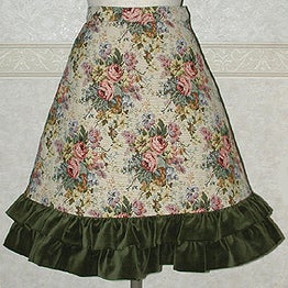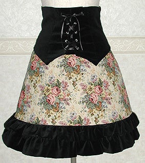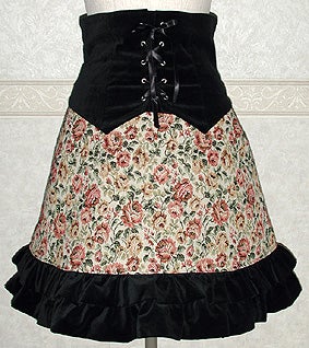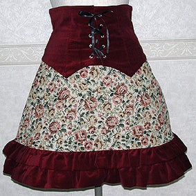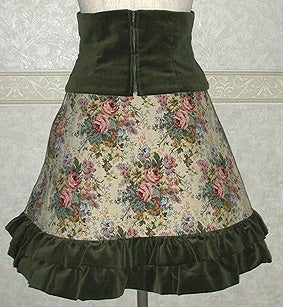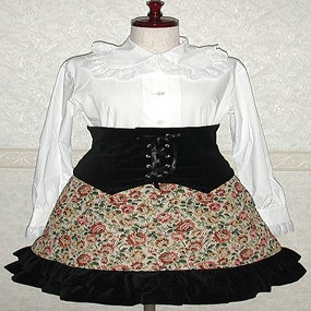 今までには無かったタイプの、コルセット風のカマーベルトが付いたゴージャスなスカートが出来ました。すそにたっぷりとフ別珍のフリルを2段付けましたので、ベルトをはずしても充分に可愛く、ラインも綺麗です。ゴブランと別珍の相性は最高ですね♪
