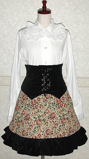 [Brand comment] I've created a gorgeous skirt with a corset-like cummerbelt, a type that has never been seen before. The hem is generously decorated with two tiers of velvet ruffles, so it's cute enough even without the belt, and the lines are beautiful. Gobelin and velvet go perfectly together!