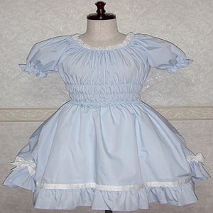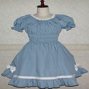 可愛いシャーリングのワンピースの登場です。シャーリングなので、サイズも前後に余裕があります。両サイドにはドレープと飾りのリボンがついていて、とってもラブリーです。TCブロードなのでブロードに比べてハリと光沢があり、ラインがとても綺麗に見えますよ♪