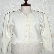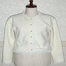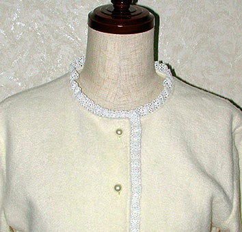 毛玉になり難い、イタリア製のフリースでとても暖かいカーディガンをつくりました。縁という縁すべてにつけたストレッチレースとパール調の玉ボタンの相性も良く、かわいいですよ♪