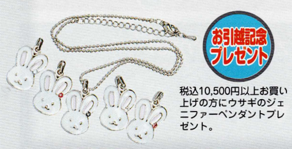[Extra notes] Our Osaka store, which closed at the end of June, will reopen in Nishi-Shinsaibashi!! To celebrate the opening, we will be holding a double stamp fair until Sunday, September 26th!! In addition, customers who spend over 10,500 yen will receive a "Jennifer the Rabbit Necklace". Please choose your favorite color at the store♪ This offer is available to all customers who make a purchase during the period. The offer will end as soon as the novelty items run out.
