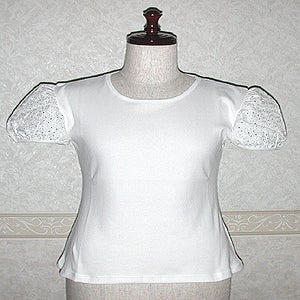 スムースのシンプルなパフTシャツが欲しかったのですが、それだけでは寂しいので、袖のパフ部分をオーバーレースにしました。レースがとても涼し気でどんなお洋服とも相性がよさそうです♪