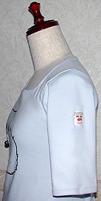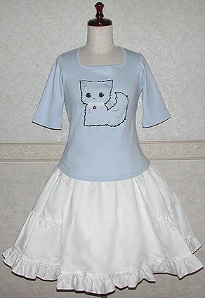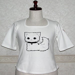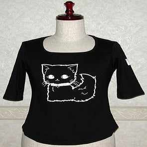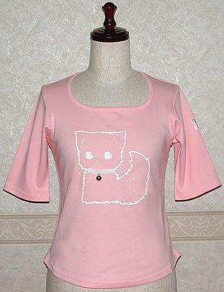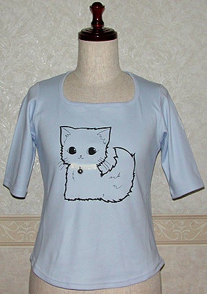 新作の可愛いネコのプリントで5分袖のTシャツを作りました。シンプルでボトムは何でもあわせやすく、普段着としてもぴったりです。飼い猫らしく、首には可愛いリボンの首輪と鈴を付けました。歩くと、鈴の音がちりちりと、またさらに可愛いです。えりぐりもデコルテを綺麗に見せてくれるデザインです。
