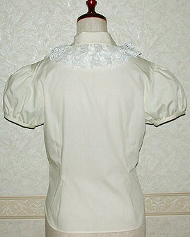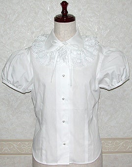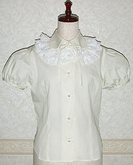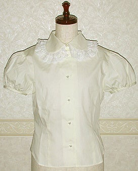 人気のハート柄レースを使った夏にぴったりのブラウスが登場です!!セットのスペアカラーをつけて2段のレースのえりをゴージャスに楽しんでも、はずしてシンプルにも使えます。ボタンもレ-スとお揃いでハートで、可愛いですよ!!