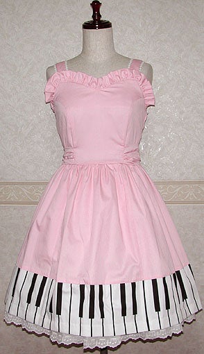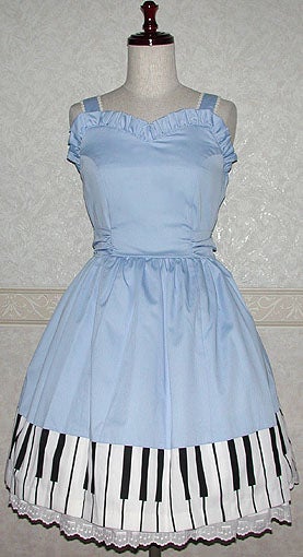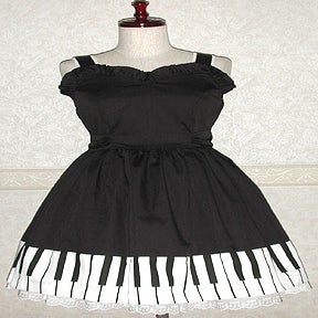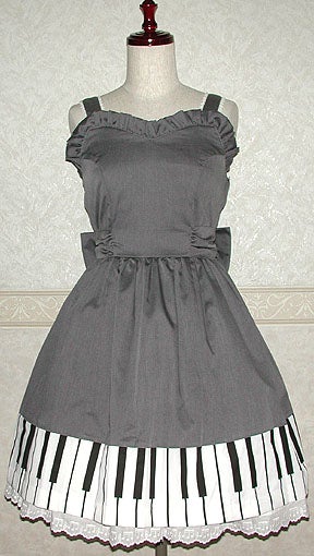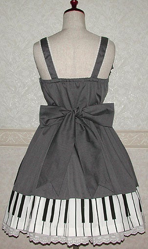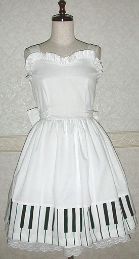 [Design notes] Fully lined. Zipper closure on the left side. The straps have chemical picot lace, and the hem has cotton musical note lace. Both types of lace are white for all colorways. The hem of the lining is lined with TC Broadcloth. There is elastic at the top of the back. The keyboard pattern is off-white with black print keys. Back waist ties are not removeable.