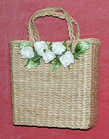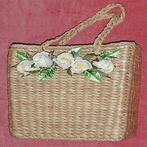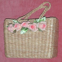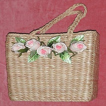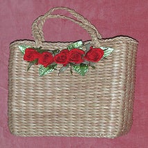 ざっくりと編んだかごに薔薇が5ヶもついたゴージャスなカゴです。 裏地もついていて、つくりもしっかりしているので、 荷物の多い方でも充分な大きさです。お洋服にあわせて薔薇のお色を選んで下さいね♪