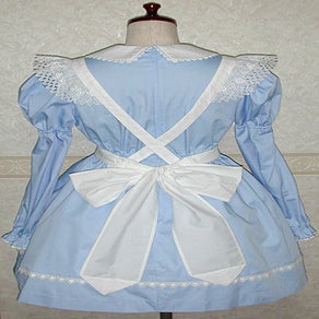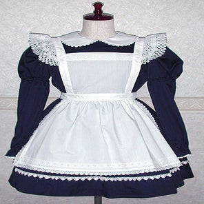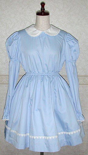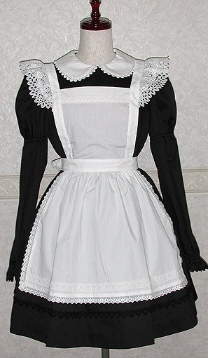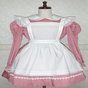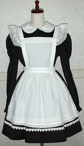 [Design notes] Back zip. The skirt portion is lined. The waist, puff sleeves, and cuffs are fully elasticized. The apron has buttons on the shoulder straps, so you can adjust them to fit perfectly. The collar and apron are white for all colorways. The lace at the cuffs and hem are the same color. The cuffs have heart lace, and the apron has rose lace on the shoulders.