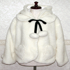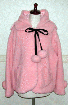 [Design notes] Fully lined. Heart-shaped pockets on both sides. Has a hood with sheep ears. The hood and ribbon can both be removed. The ribbon is made of velvet. Both the ribbon and cuffs of the arms have pompoms.