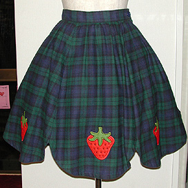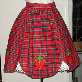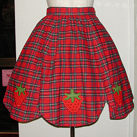 has a strawberry appliqué on it. The bright red strawberries and tartan check go really well together. Wear it casually with a top or cutely with a blouse.