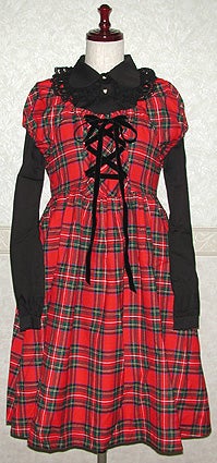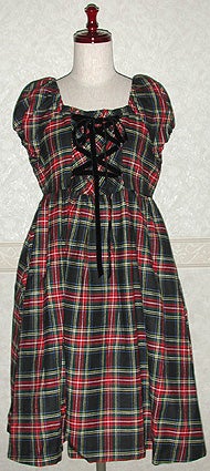 [Brand comment] This is a loose-fitting tartan checked jumper skirt. The cute lace-up part at the chest gives it a babydoll look. It's a pull-on style, so it's easy to put on and take off. Pair it with a cute long-sleeved blouse.
