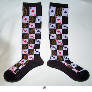 [Design notes] These high socks feature a complex arrangement of playing cards and clocks. The pattern width narrows from the opening to the ankle so that the pattern looks evenly spaced when worn. It's a little hard to see in the picture, but the off-white has a checkered pattern of "off-white x white."