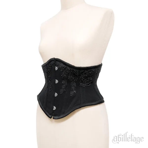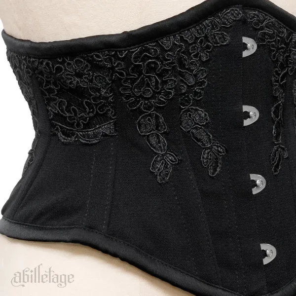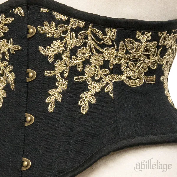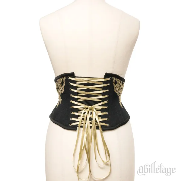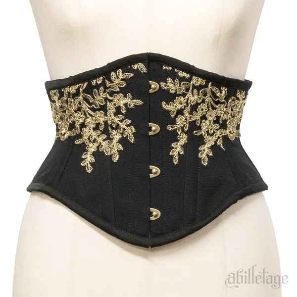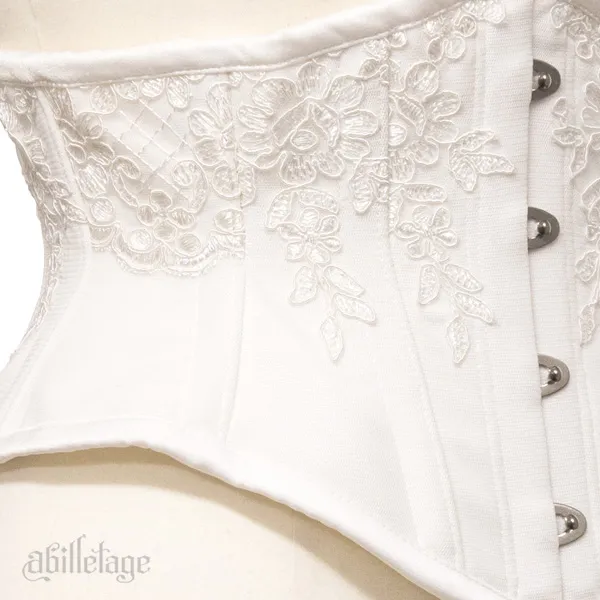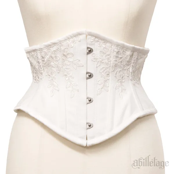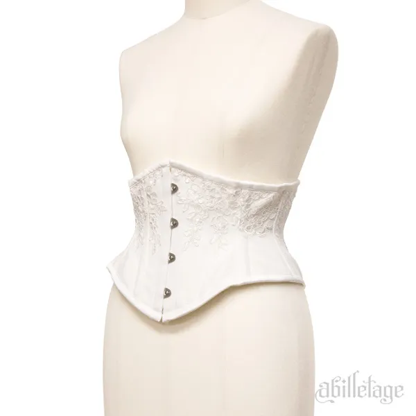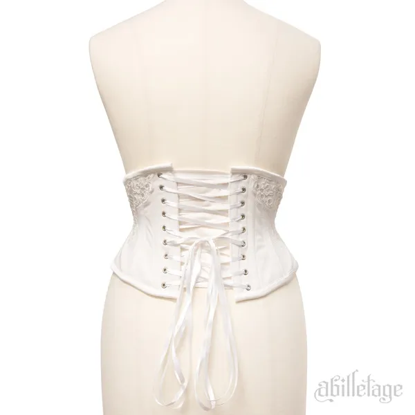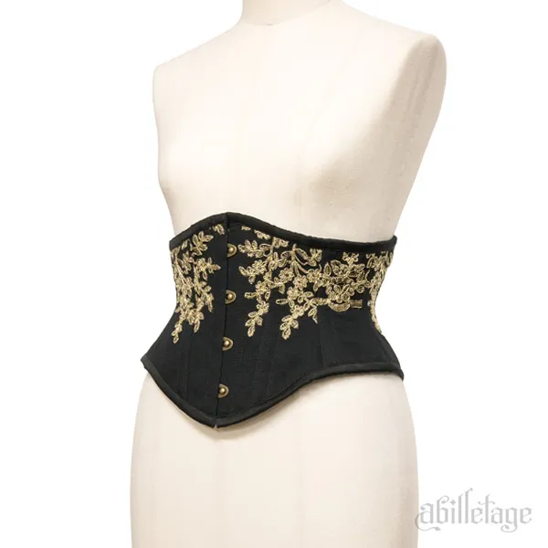 The corset fastens with a center front basque closure. It contains 8 spiral bones and 4 steel bones.