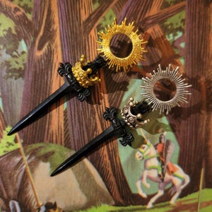 A sun shaped stud earring with black sword and crown charms. Studs and charms are all solid brass."
