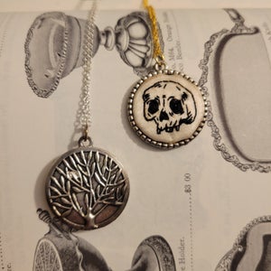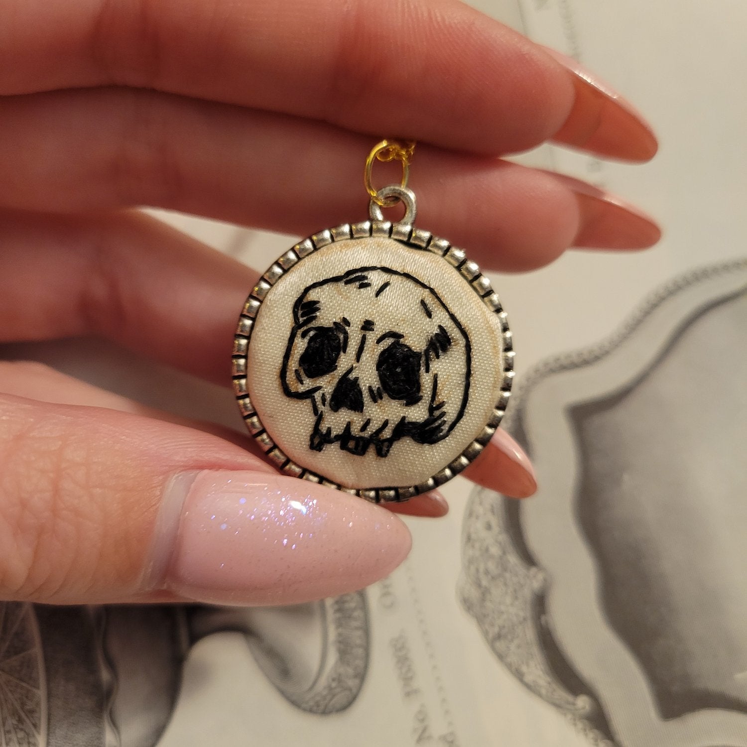 A tiny hand embroidered skull in black silk thread. The pendant case features a dimensional tree design on the reverse. The embroidery is secured into the pendant with pH neutral glue that should not yellow with age. Comes with a gold or silver chain for wearing.