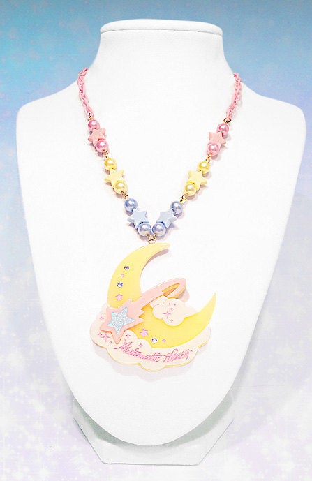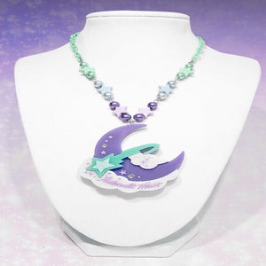 [Official colorways] - spooky lavender - light yellow [Official item description] This necklace is made from our light buttery yellow acrylic or our "Spooky lavender" acrylic (we call it spooky because it's a slightly darker blue based lavender). This very special necklace hangs from a pink or mint green plastic chain with hand dyed glass pearls separated by cute little star beads. Each moon has 3 Swarovski crystals and a glittery shooting star. Each necklace is handmade so your necklace may be a little different from the one pictured above. SIZE: Moon measures 2.17" x 2.25". Hangs on a 20" chain including beads.