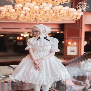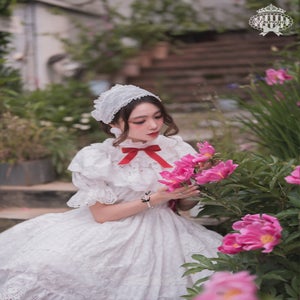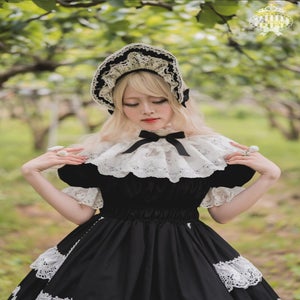 This one-piece dress captures the romance of old-school Lolita with its voluminous puff sleeves and elastic waist shirring that create a lovely silhouette, while the skirt is delicately adorned with rose-motif lace. The detachable sleeves and collar allow for a variety of styling options, and when paired with the bonnet, it resembles a bouquet of flowers, creating an even more elegant and sophisticated look.