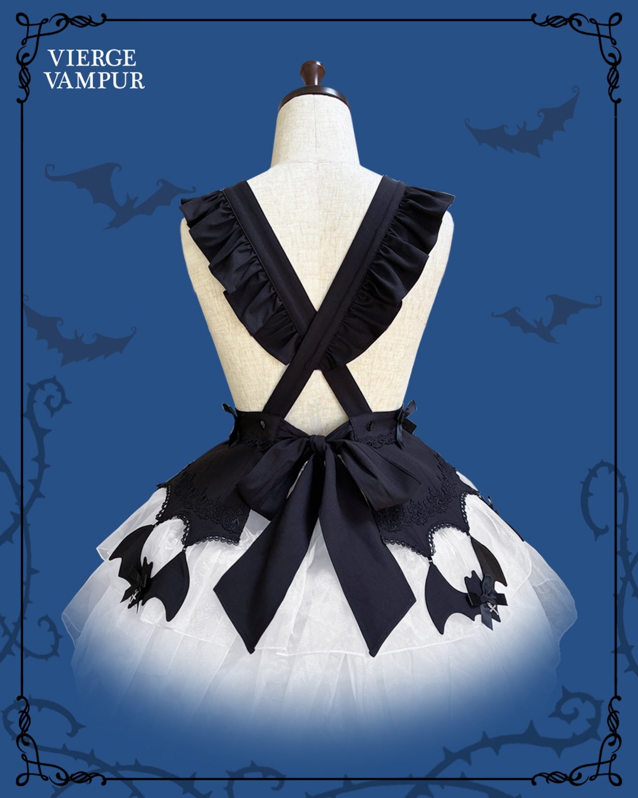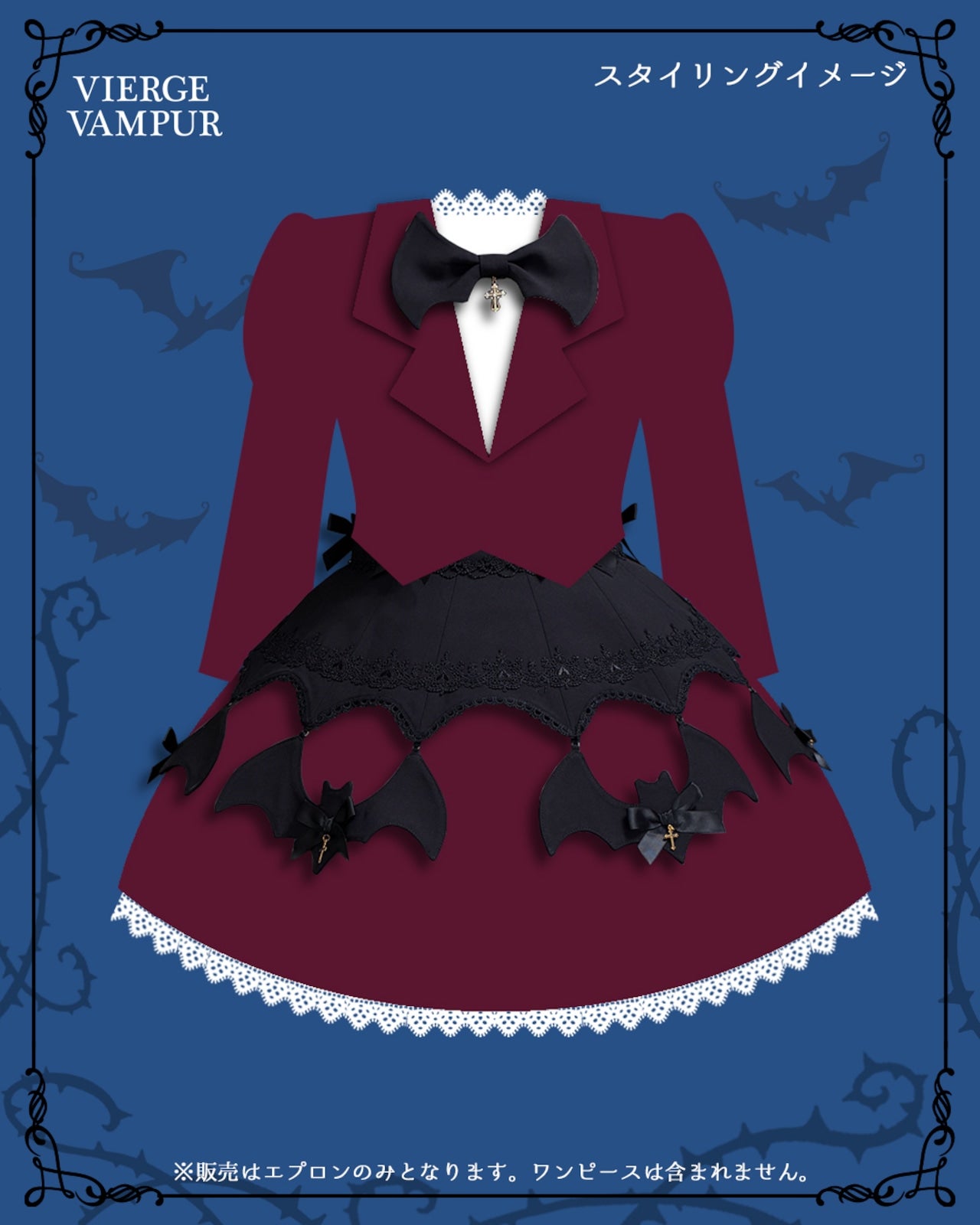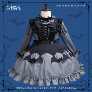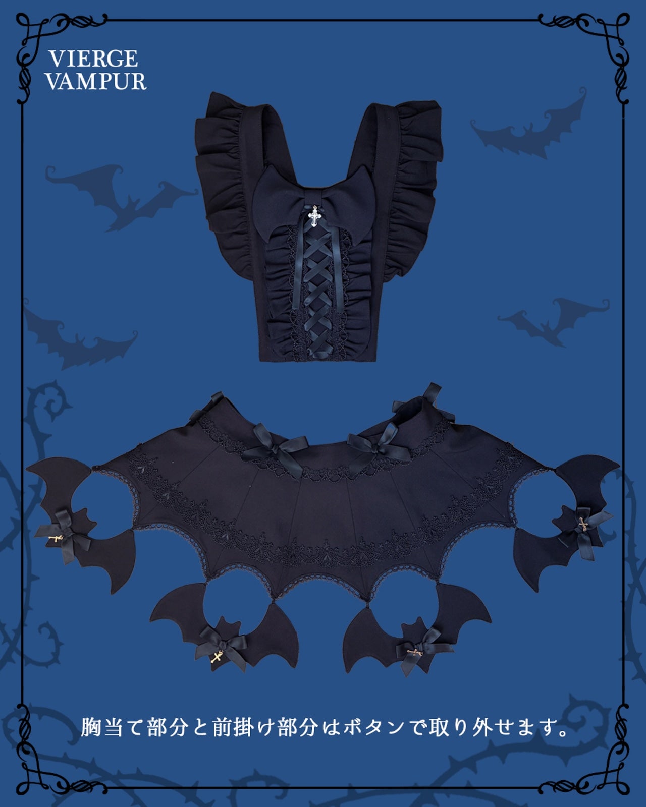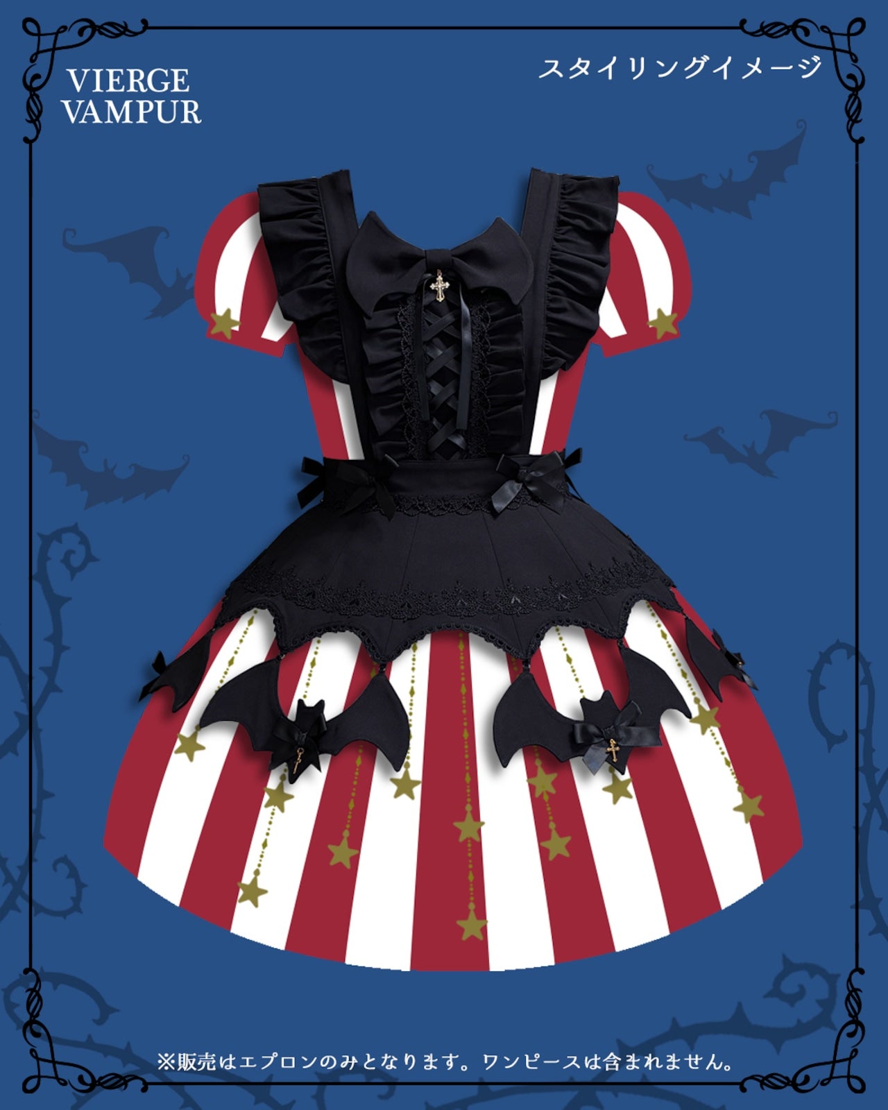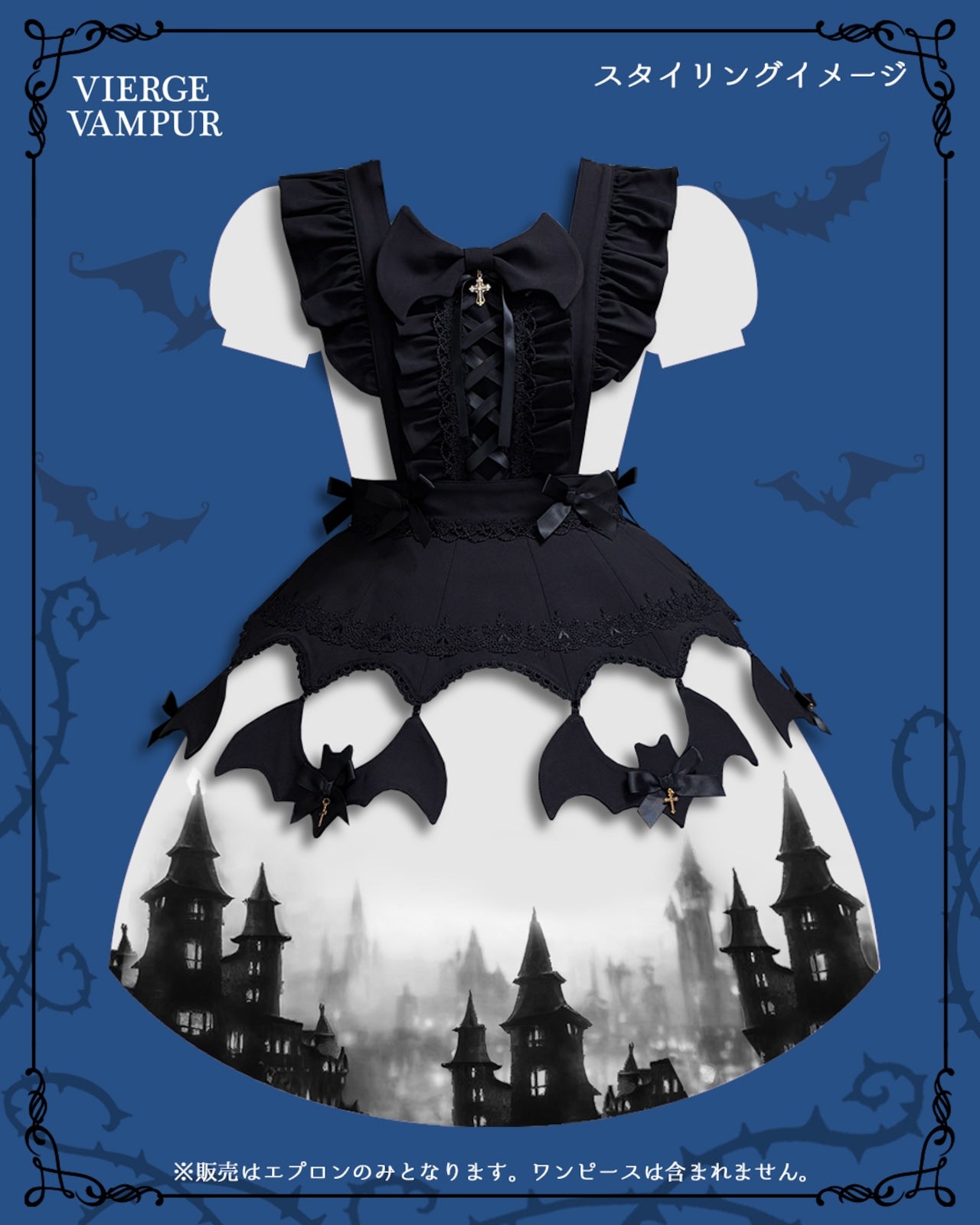 楽しげに飛び回るコウモリたちのパーティーをイメージした華やかなエプロン。胸当てと前掛けはボタンで取り外しできる仕様で、幅広いコーディネートが楽しめます。