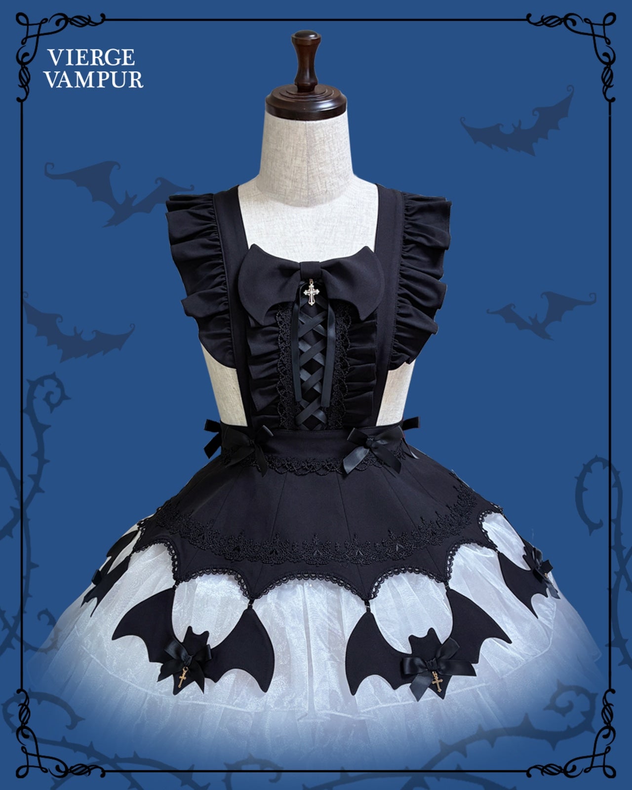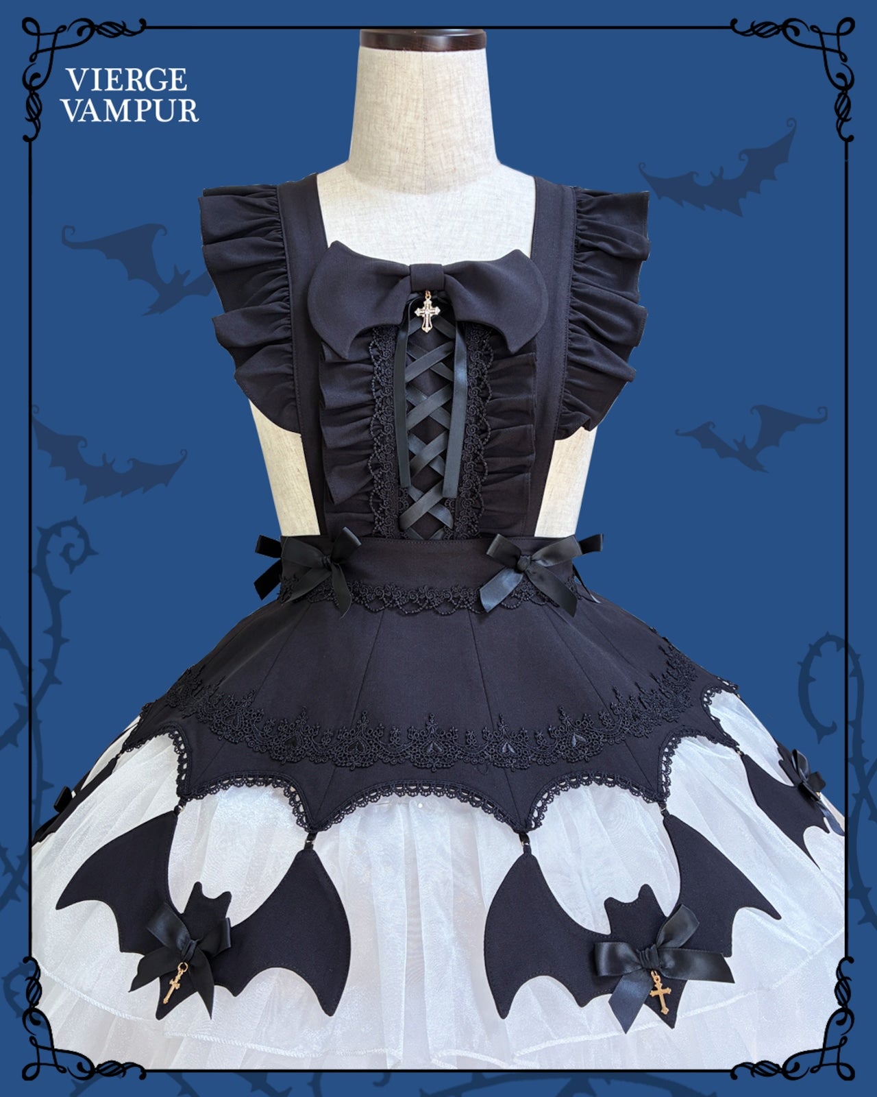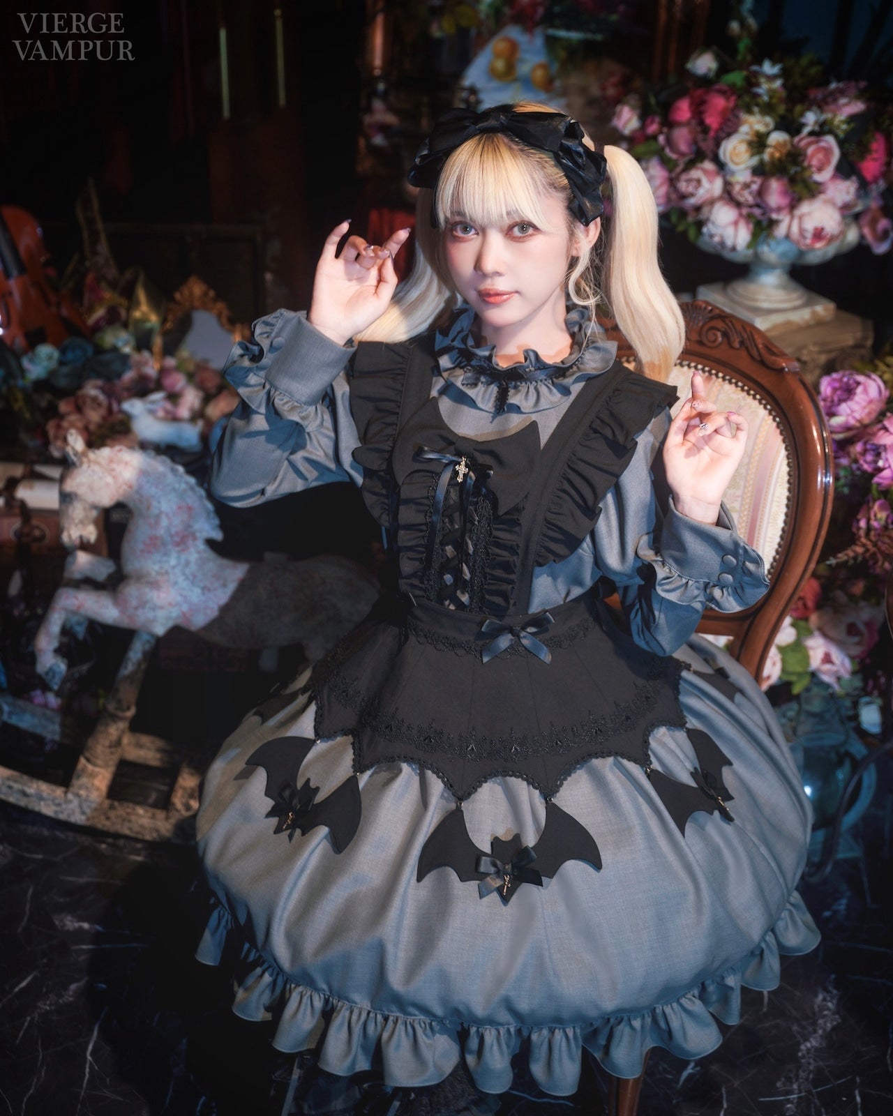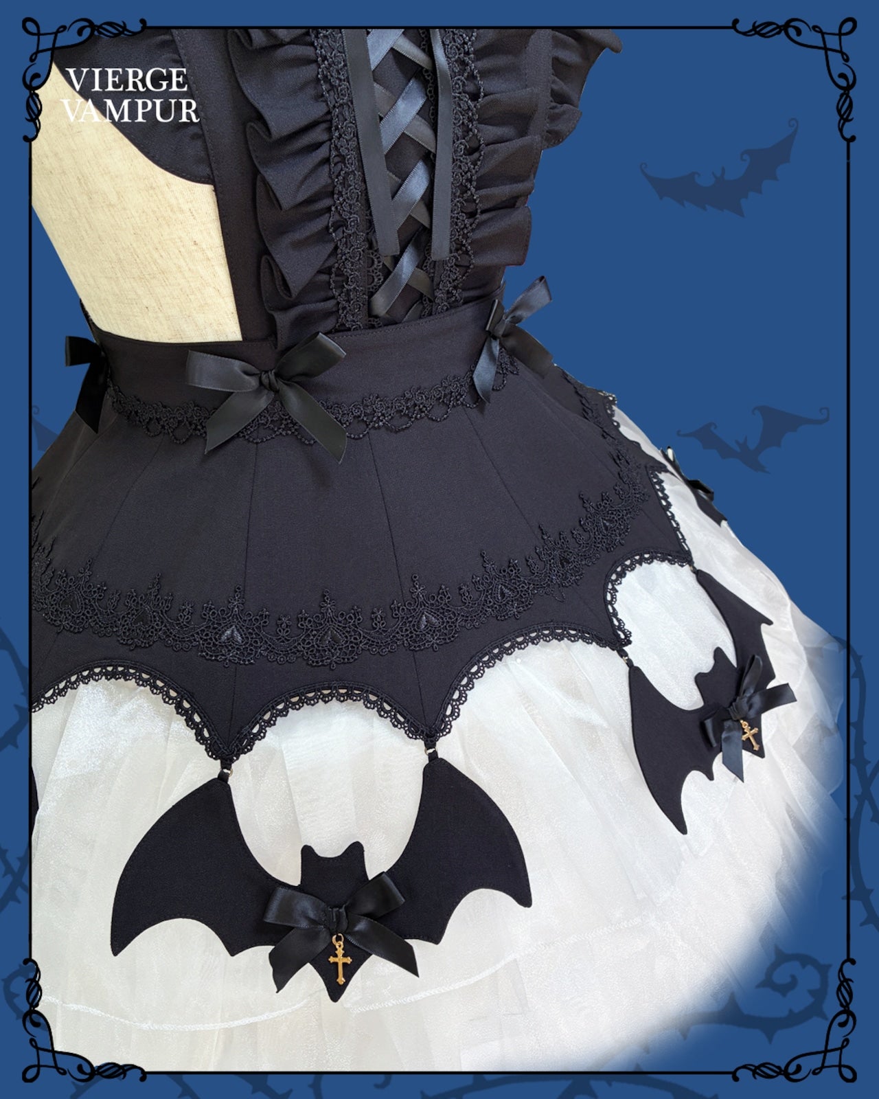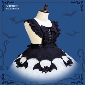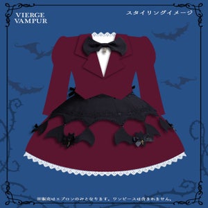 楽しげに飛び回るコウモリたちのパーティーをイメージした華やかなエプロン。胸当てと前掛けはボタンで取り外しできる仕様で、幅広いコーディネートが楽しめます。