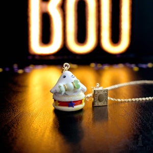 Our Ghost now loves their candy! And now sits on top of a cute vanilla cookie with a delicious orange cream filling with sugar stars! We couldn't take away their book so the necklace features a cute book charm as well!