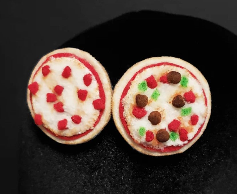 These are bagel bite hair clips or pins designed and hand made by me. The listing is for one bagel bite. They are made of a molded felt plush filled bagel base with red felt sauce, savory inked plush fabric cheese, and felt pepperoni, sausage, and bell pepper toppings. The piece secures with either a small snap clip, a pin hand sewn to the underside, both clip and pin, or no fastening for desk decor!