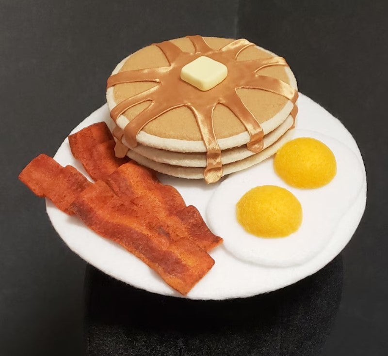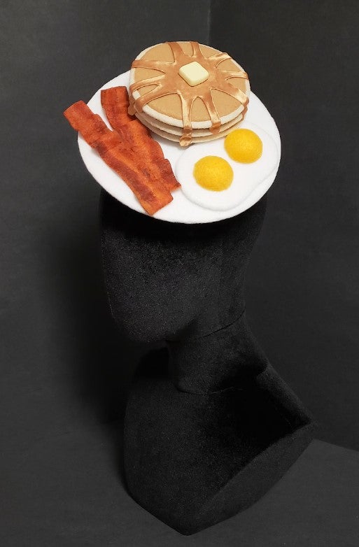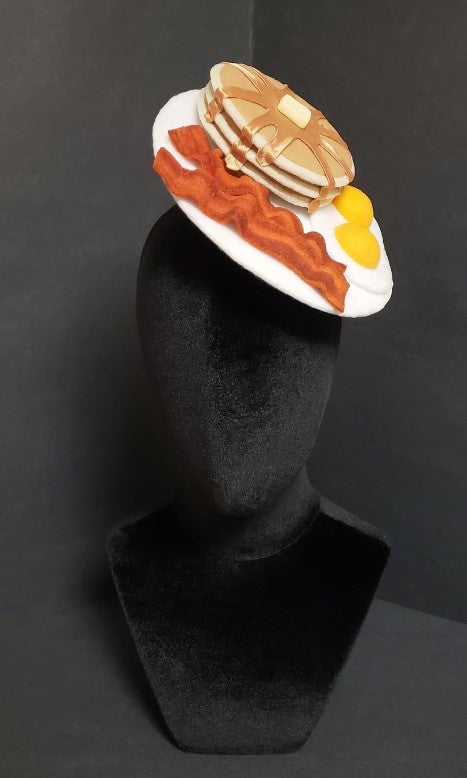 This is a pancake brunch hat designed and made by me! It is made of a felted pancakes with a satin fabric honey syrup, felted double sunny side up eggs, and hand painted felt bacon all on a white felt plate. The piece secures with either two alligator clips adhered to the underside, a black satin ribbon headband, or no fastening for desk decor!