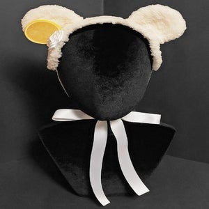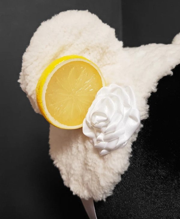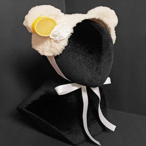 This is an ice cream bear designed and handmade by me. It is made of a plush pastel yellow fabric and a yellow cotton fabric underside with white braid gimp trim. The headdress is embellished with plush bear ears and lemon slice hand sewn to the base with a white satin ribbon whipped cream dollop. The piece fastens with a white double face satin ribbon that ties into a bow beneath the chin.