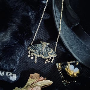 A beautiful moth necklace with a beautiful starry sky on its wings.