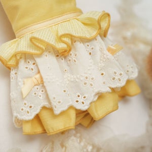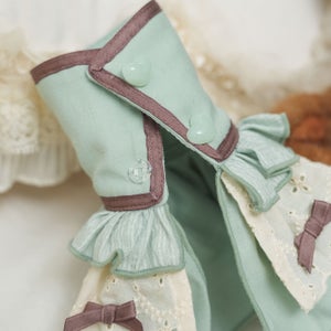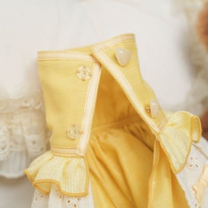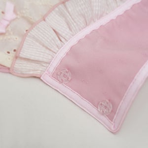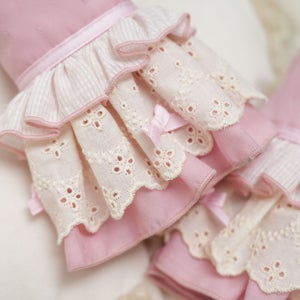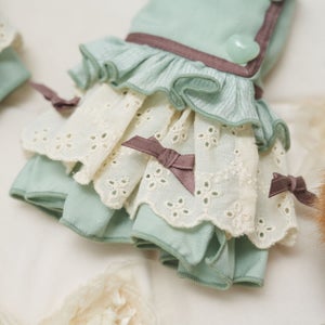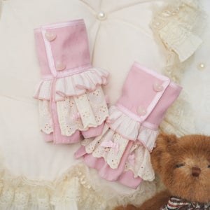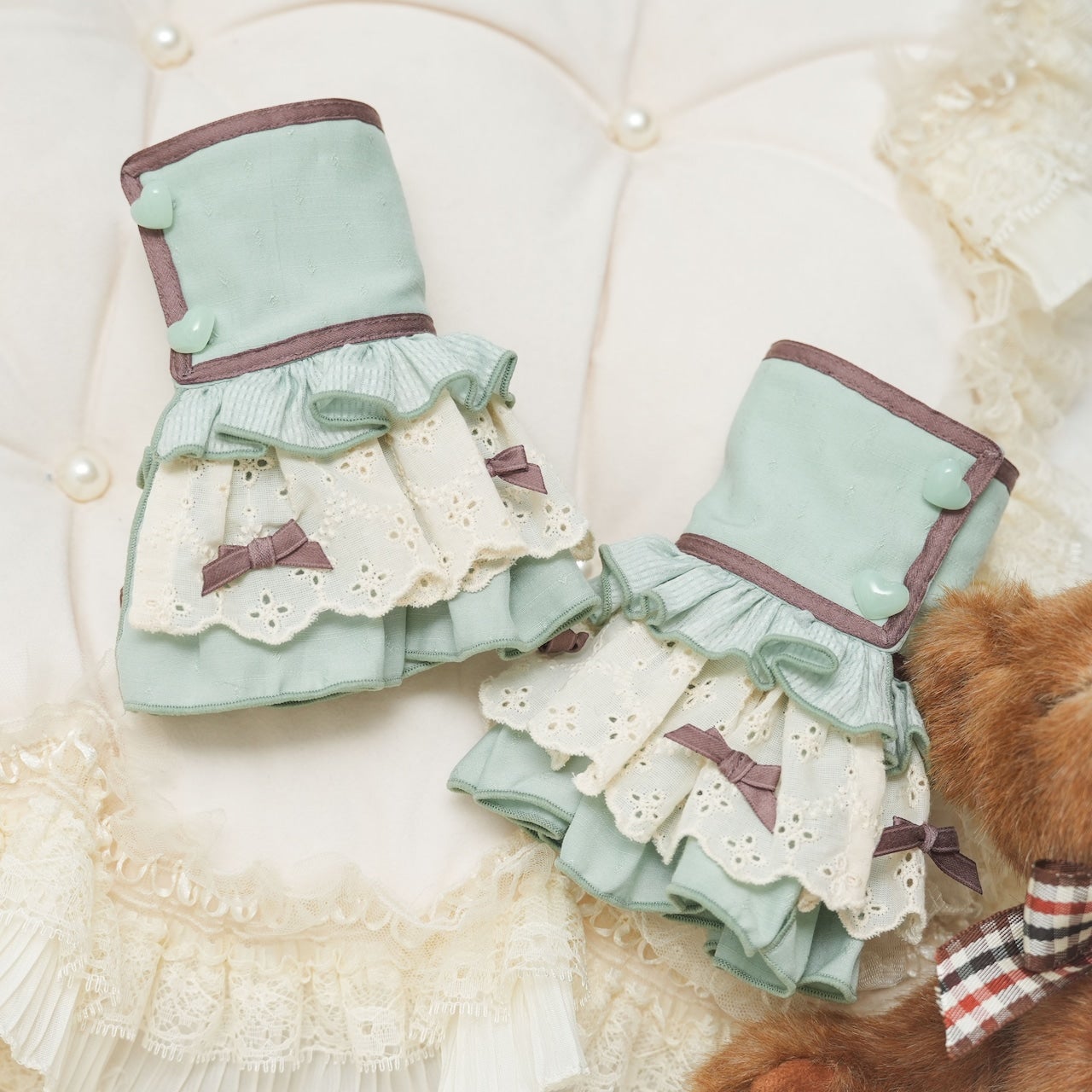 [Brand comment] Introducing sweet, cake-like sleeve cuffs! The trim on the cuff adds a touch of sweetness reminiscent of chocolate. The three-tiered ruffles, made from different materials, resemble cake sponge and whipped cream. The small ribbon embellishment adds to the cute atmosphere. The sleeve cuffs have snap closures for easy attachment and removal. The heart-shaped decorative buttons also contribute to the overall adorable design. How about pairing them with the matching jumper skirt and blouse from the same series for a complete pastry chef-inspired look?