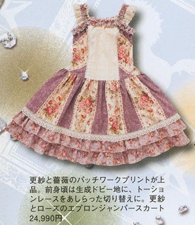 Brand comment: Patchwork apron JSK with chintz pattern, old rose, and ecru dobby.I used plenty of generated torsion lace. (Note) The image is a sample. The shape of the waist ribbon will be slightly changed.