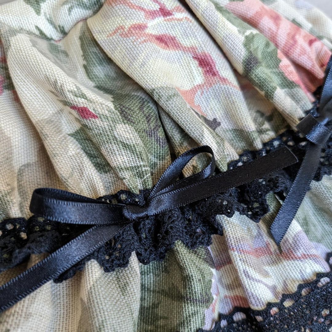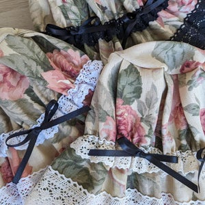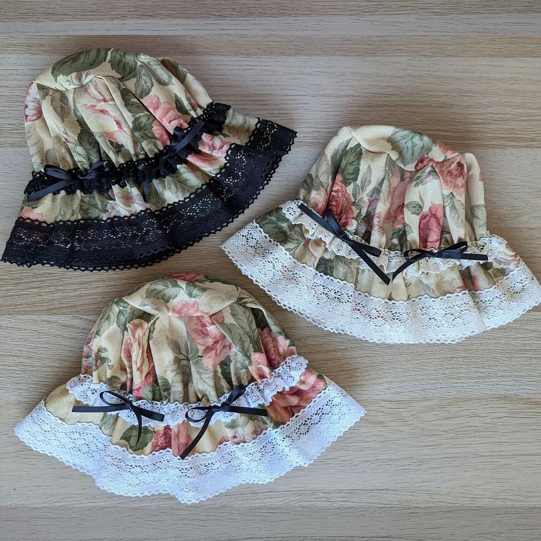 The Bonnets are made from a vintage floral gobelin fabric that was found in a charity shop