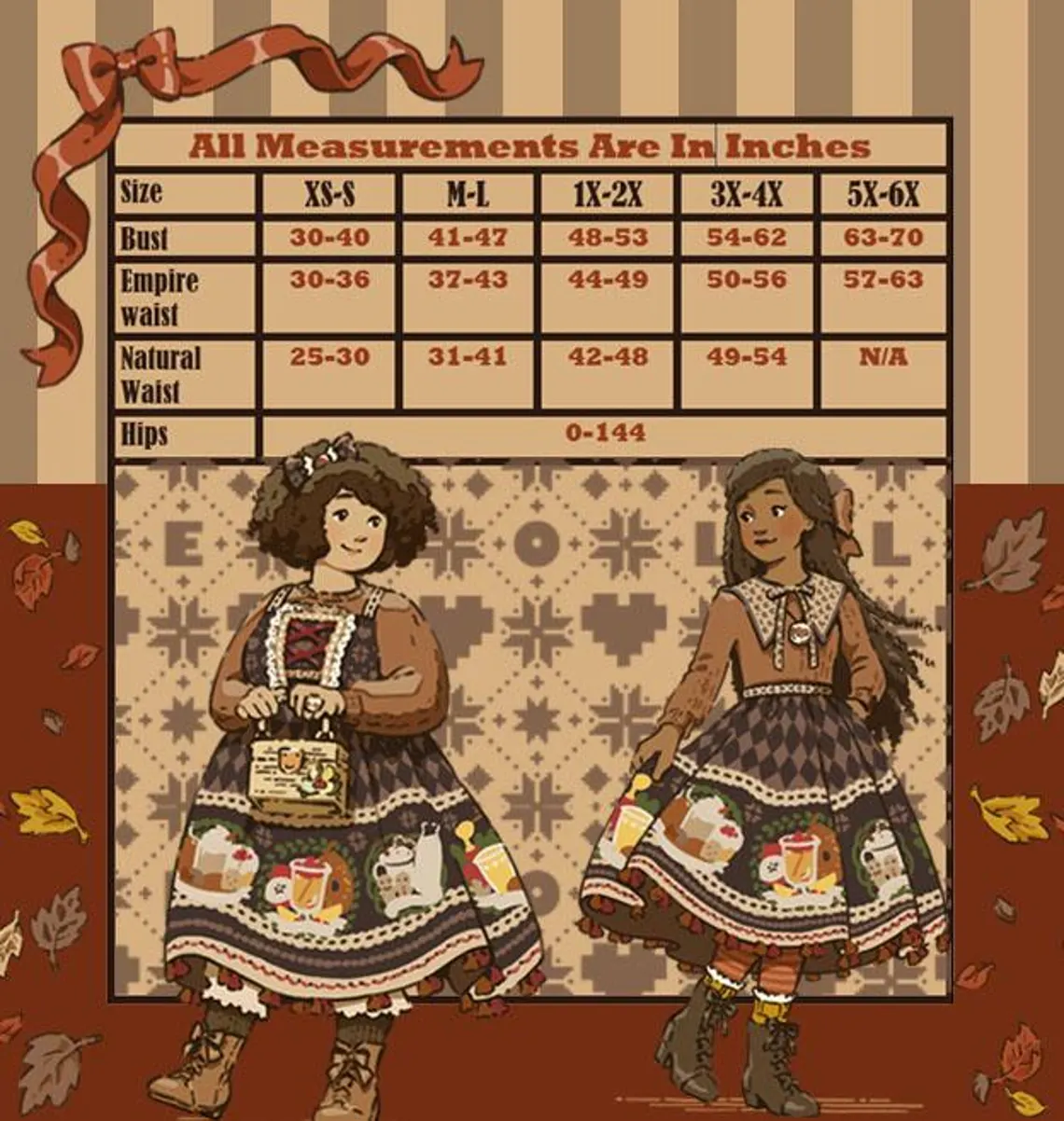 Empire Waist XS-S: 30-36 in | Natural Waist XS-S: 25-30 in | Empire Waist M-L: 37-43 in | Natural Waist M-L: 31-41 in | Empire Waist 1X-2X: 44-49 in | Natural Waist 1X-2X: 42-48 in | Empire Waist 3X-4X: 50-56 in | Natural Waist 3X-4X: 49-54 in | Empire Waist 5X-6X: 57-63 in | Natural Waist 5X-6X: N/A