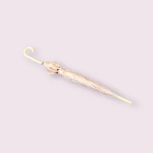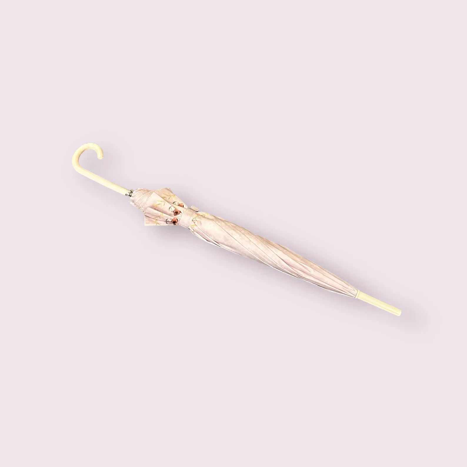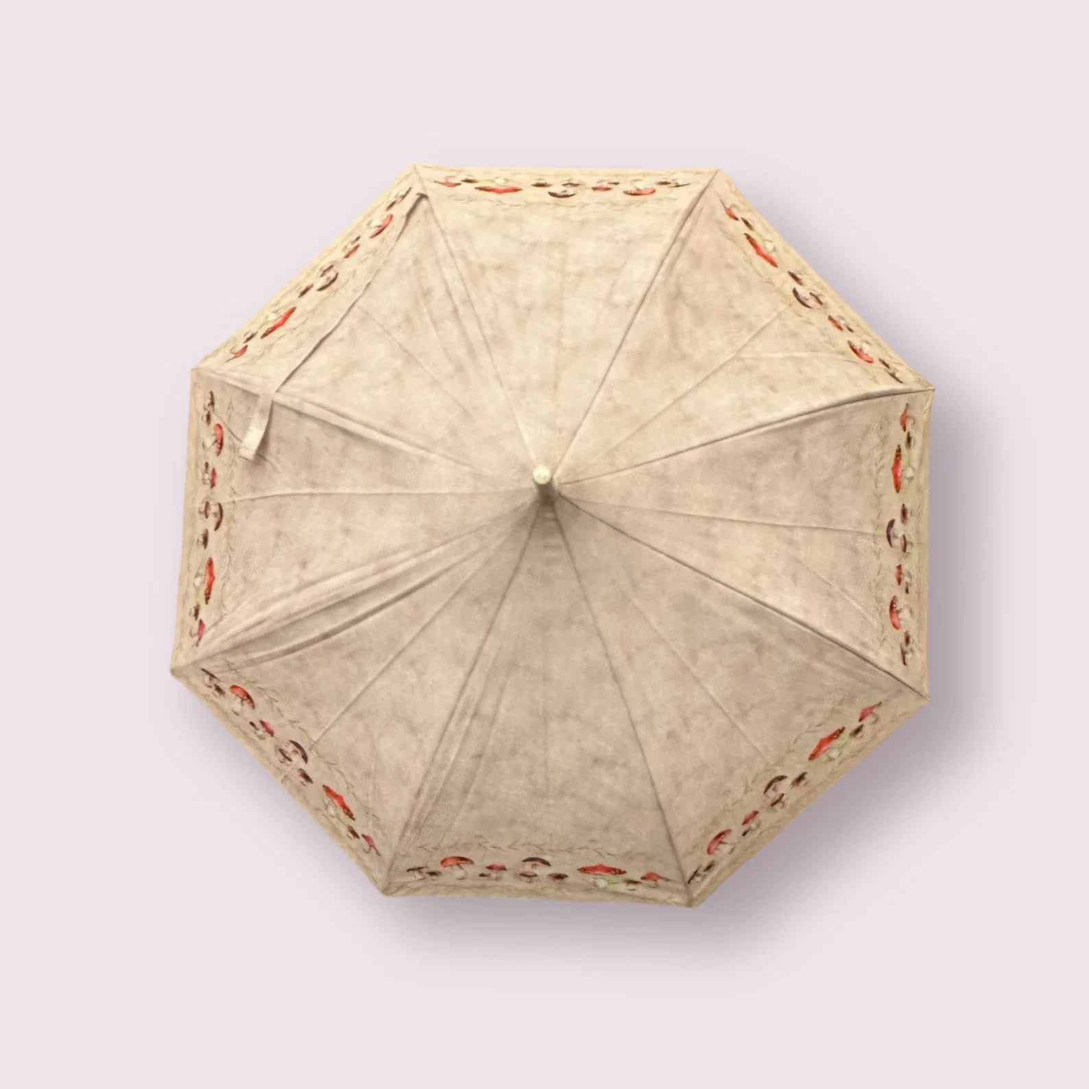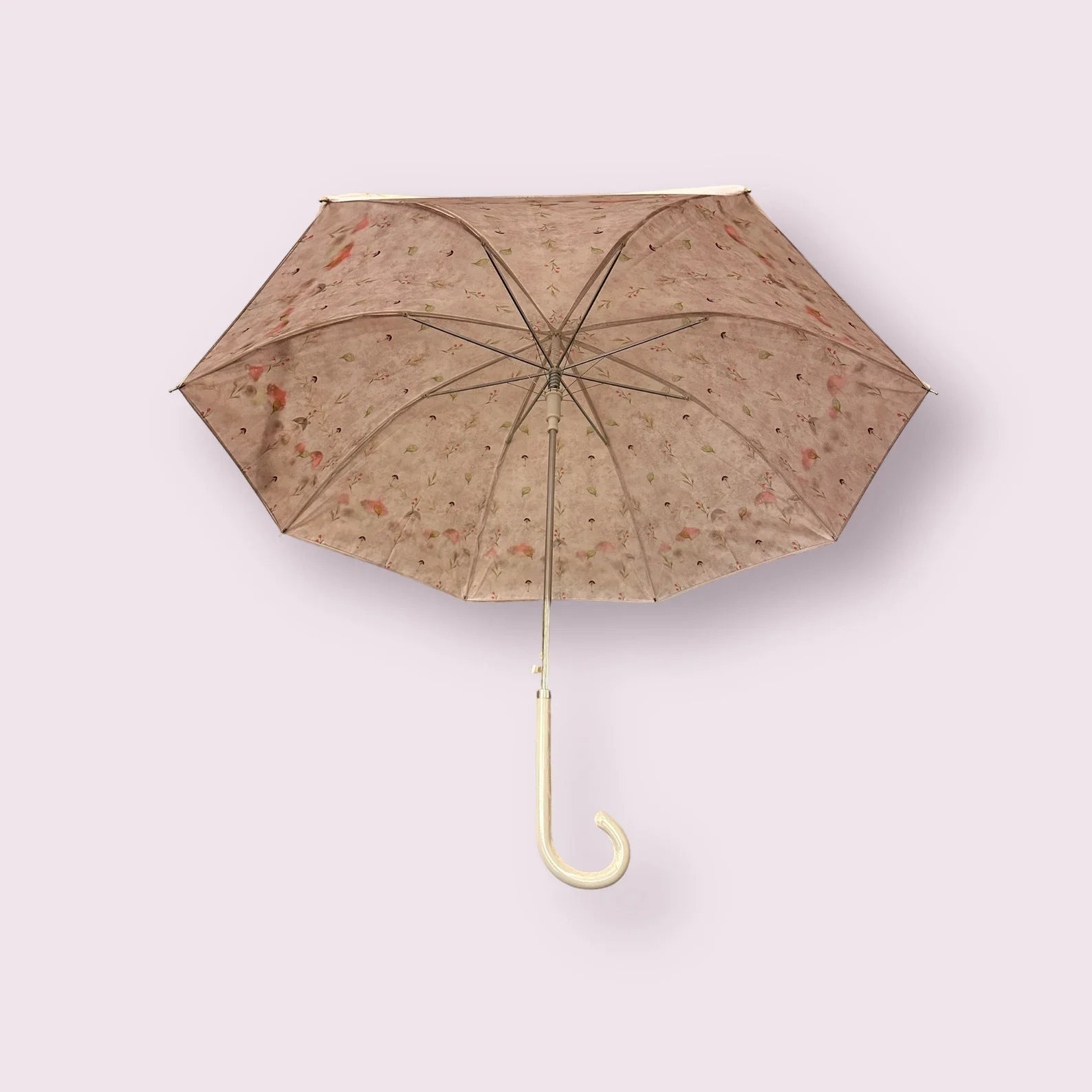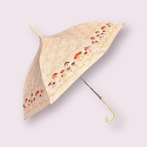 [Brand comment] Forest Mushrooms umbrella can be used both in the rain and as a parasol. Beige background with leaf border and mushrooms print. Leaf and berries printed fabric lining. Made with metal frame. Handle is covered in cream fabric.