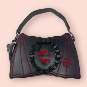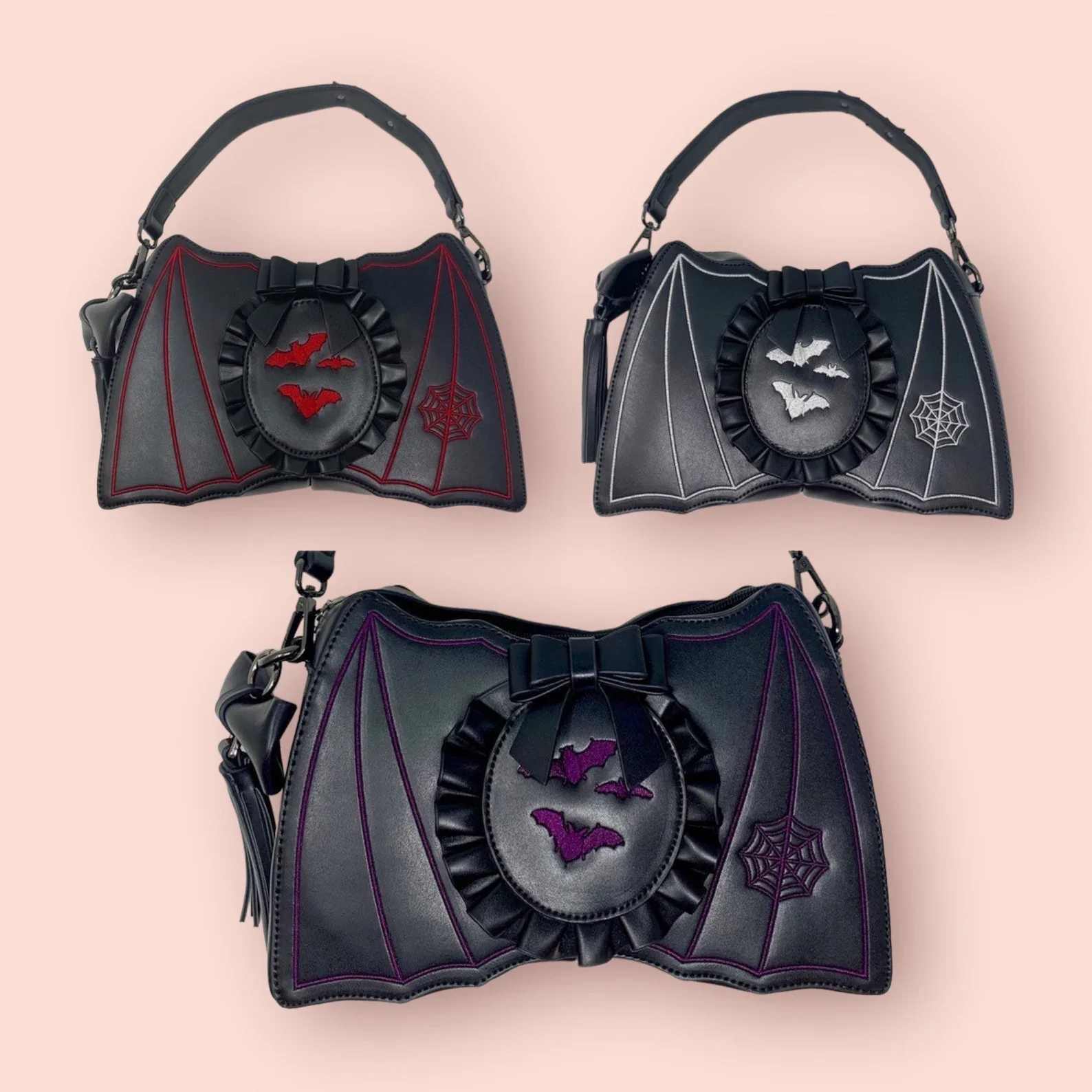 Bat shape handbag with embroidered wings with bats embroidered cameo and bow. Decorated with bow tassel. Top handle interchangeable with long strap.