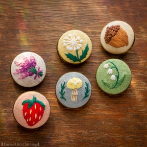 A 1" embroidered pin, made of linen for a beautiful vintage look. Each one has a bar pin backing for easy attachment to your favorite bag, cardigan, or blouse!