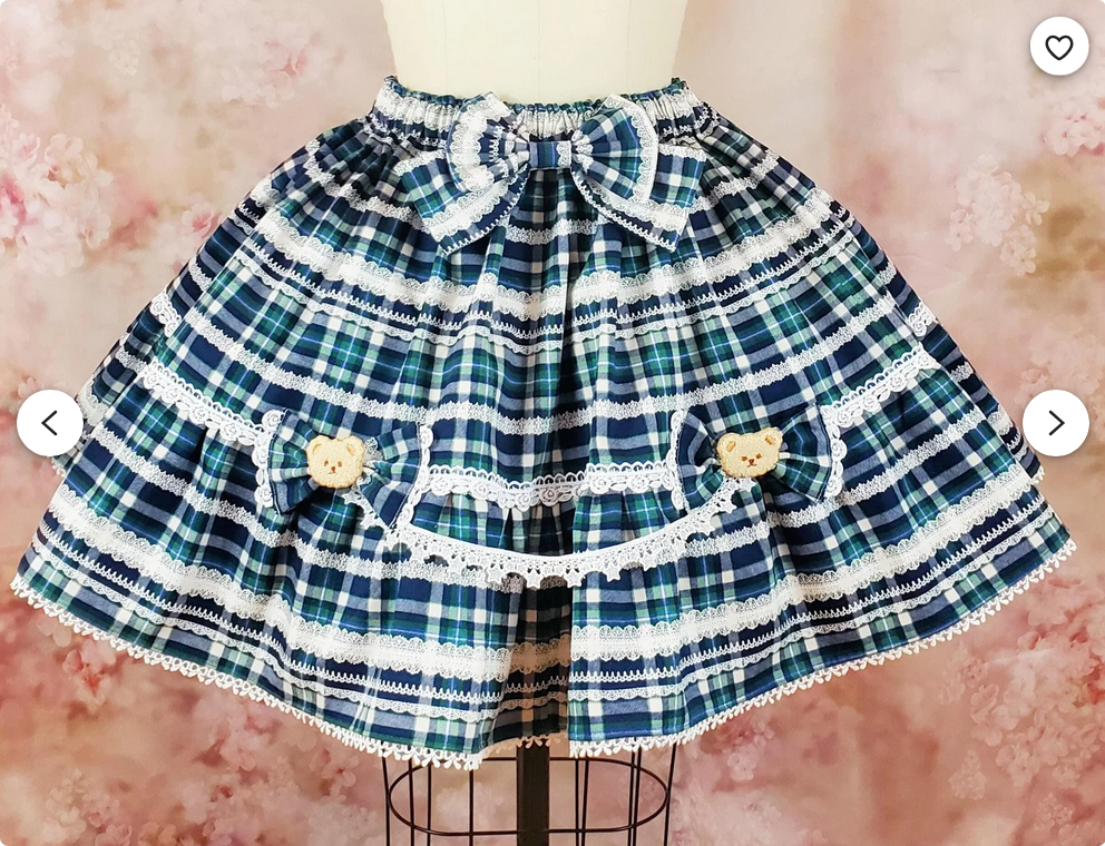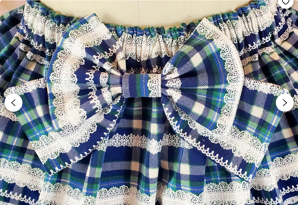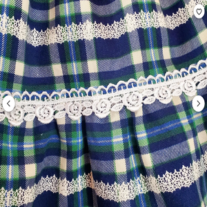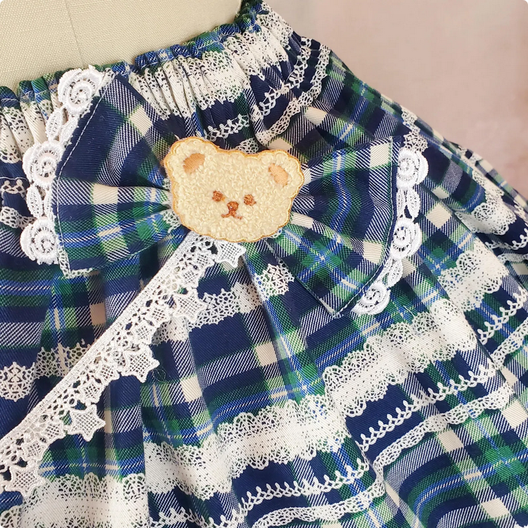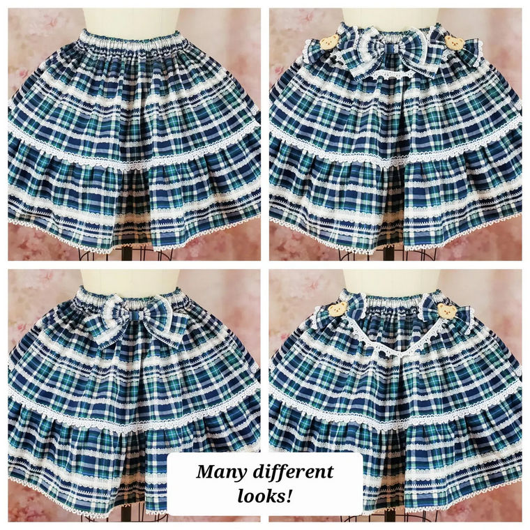 This plaid lolita style skirt is made from a high quality 100% cotton fabric imported from Japan. The print features colors of deep green, blue, and cream, with lace details printed on the fabric. It features a ruffle at the hem, edged with white poly/cotton bow-shaped lace for an adorable touch. There is also white venise cotton rose lace trim, lace trimmed teddy bear bows, and a large waist bow. Full elastic waistband which is sturdy yet super stretchy, to fit waist sizes from 36"- 43" (US Women's 2X-3X).
