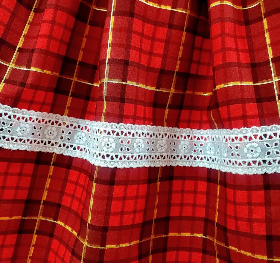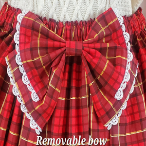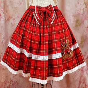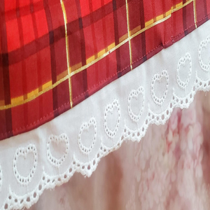This red tartan plaid lolita style skirt is made from a 100% cotton print fabric with a full poly lining. Perfect for your sweet lolita or kawaii wardrobe. 2 different types of high quality white lace adorn the skirt, including a unique bow print lace at the hem.