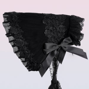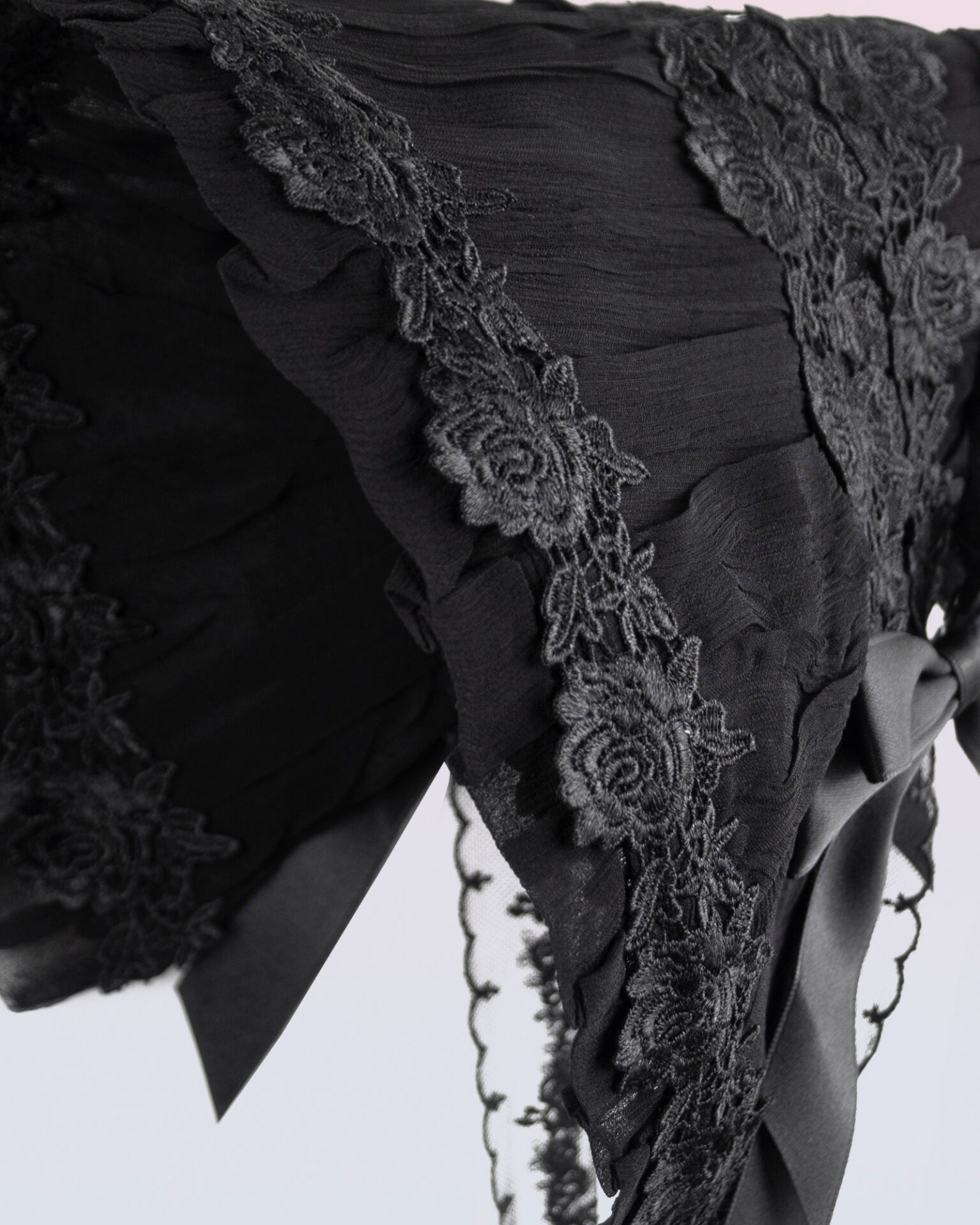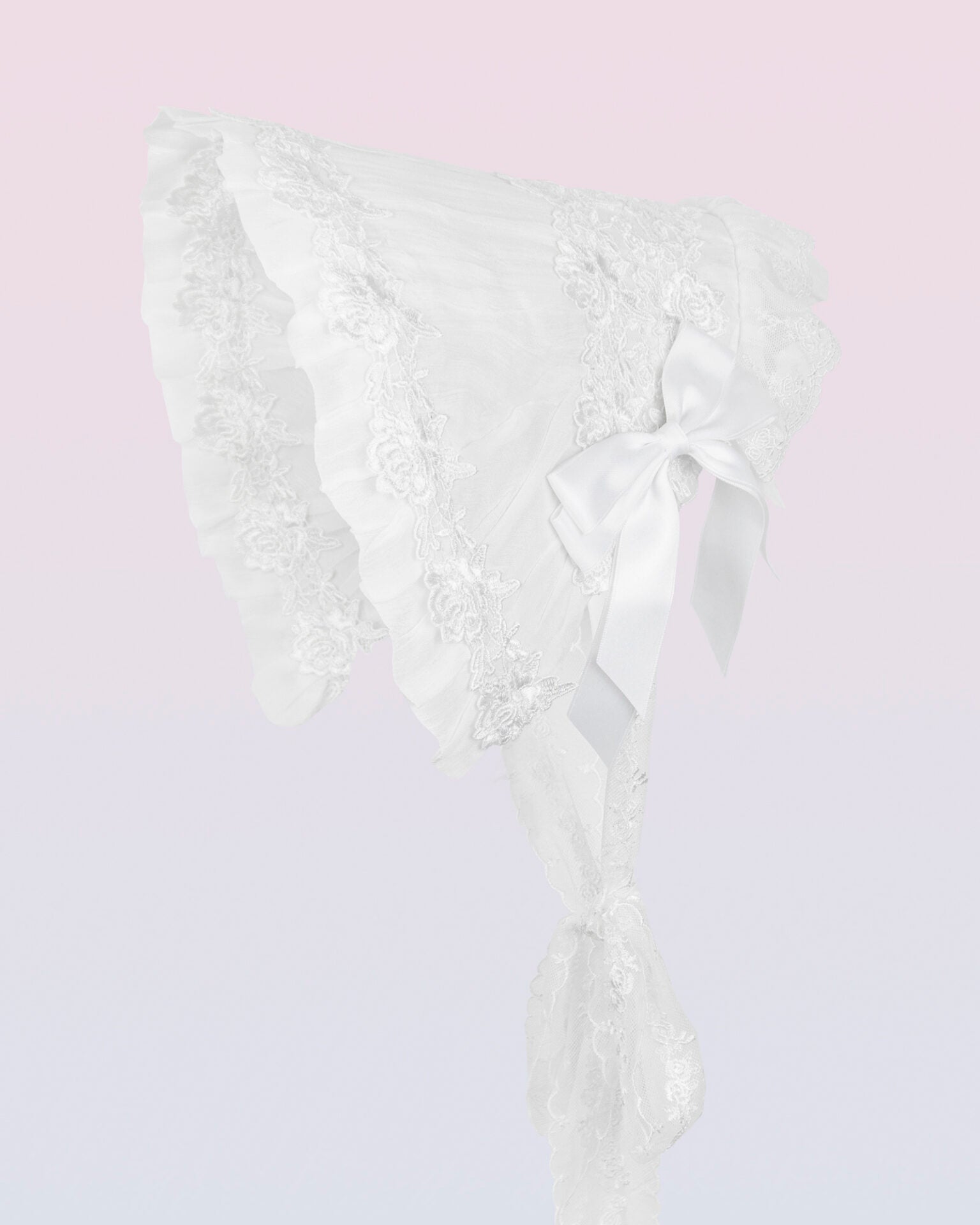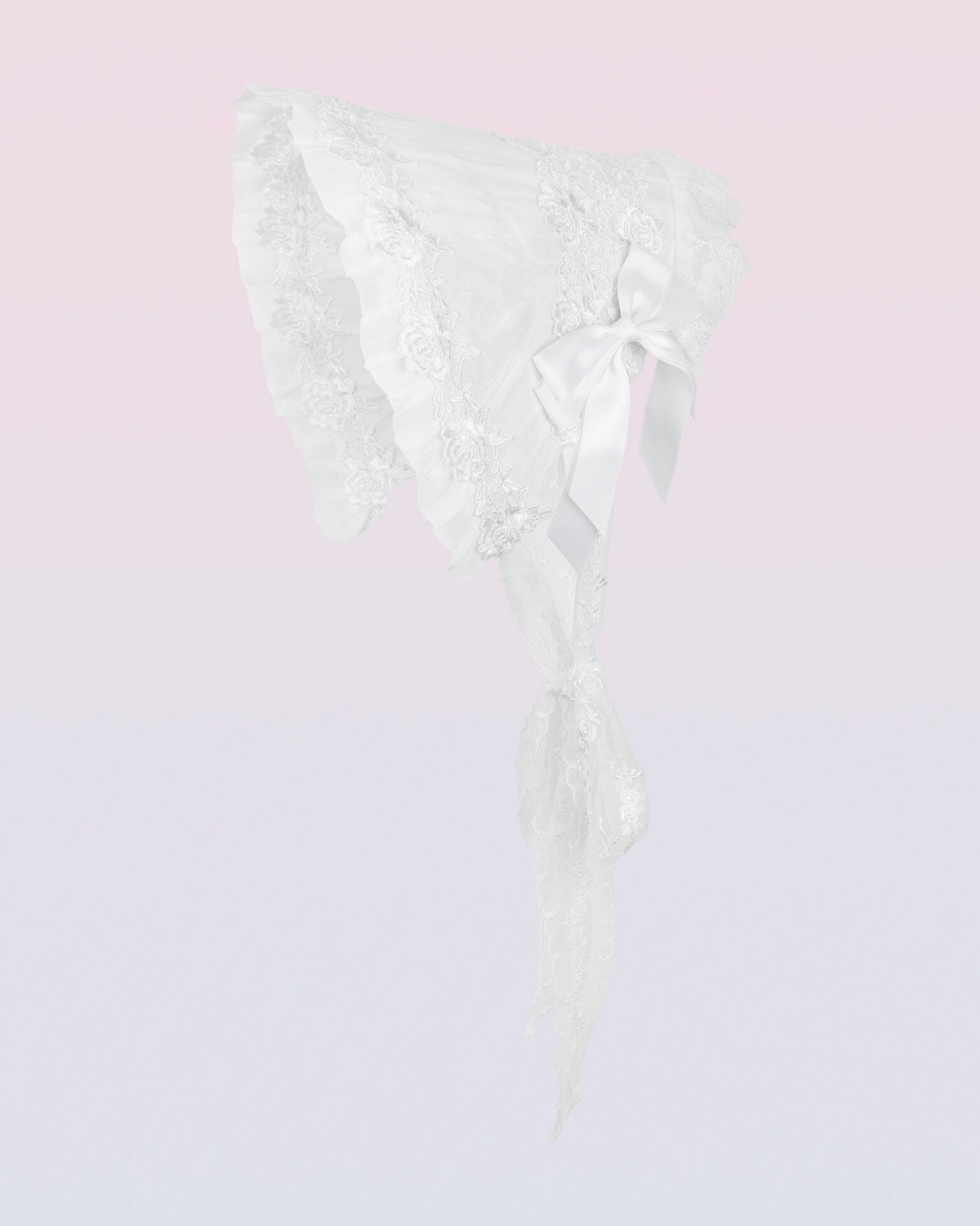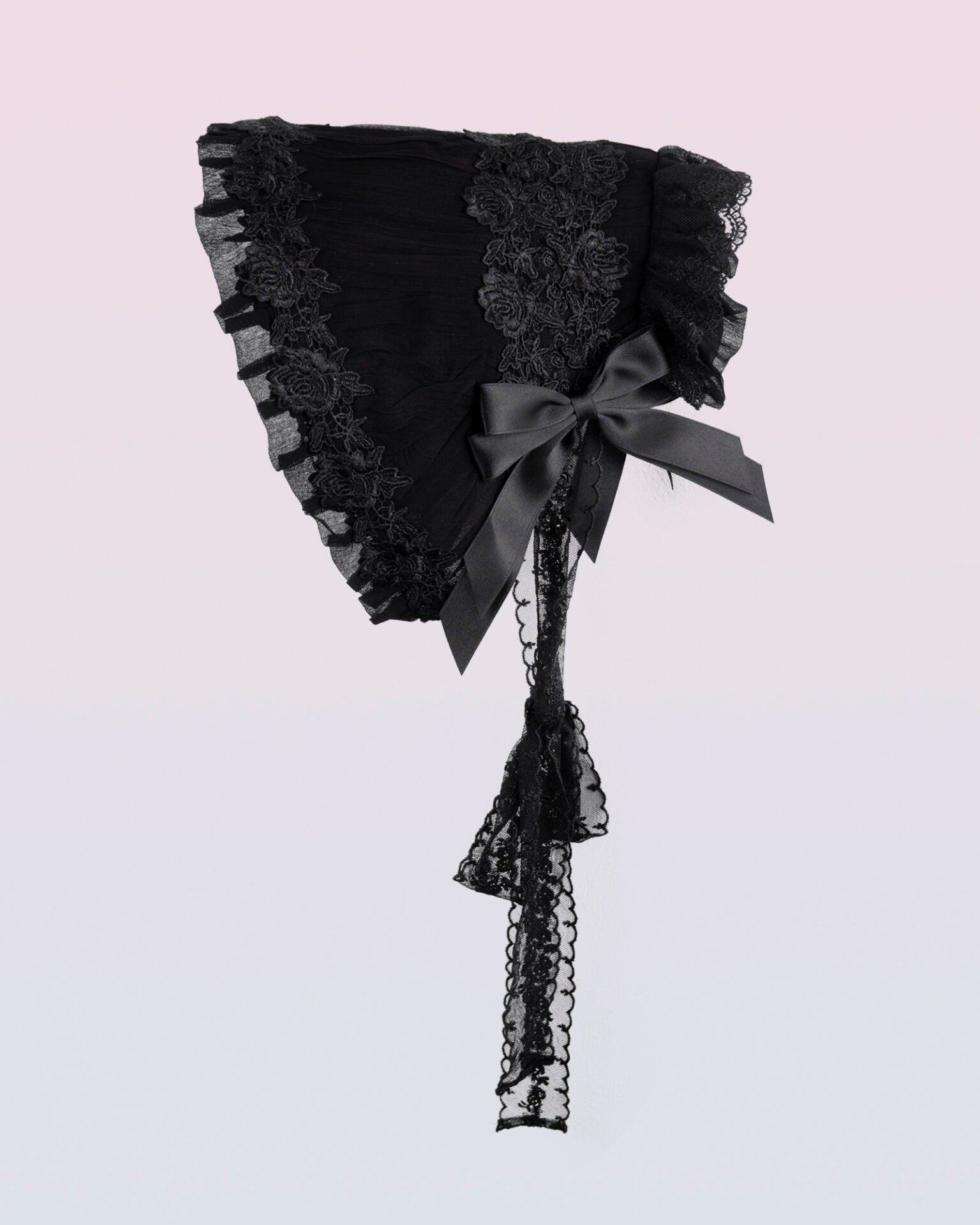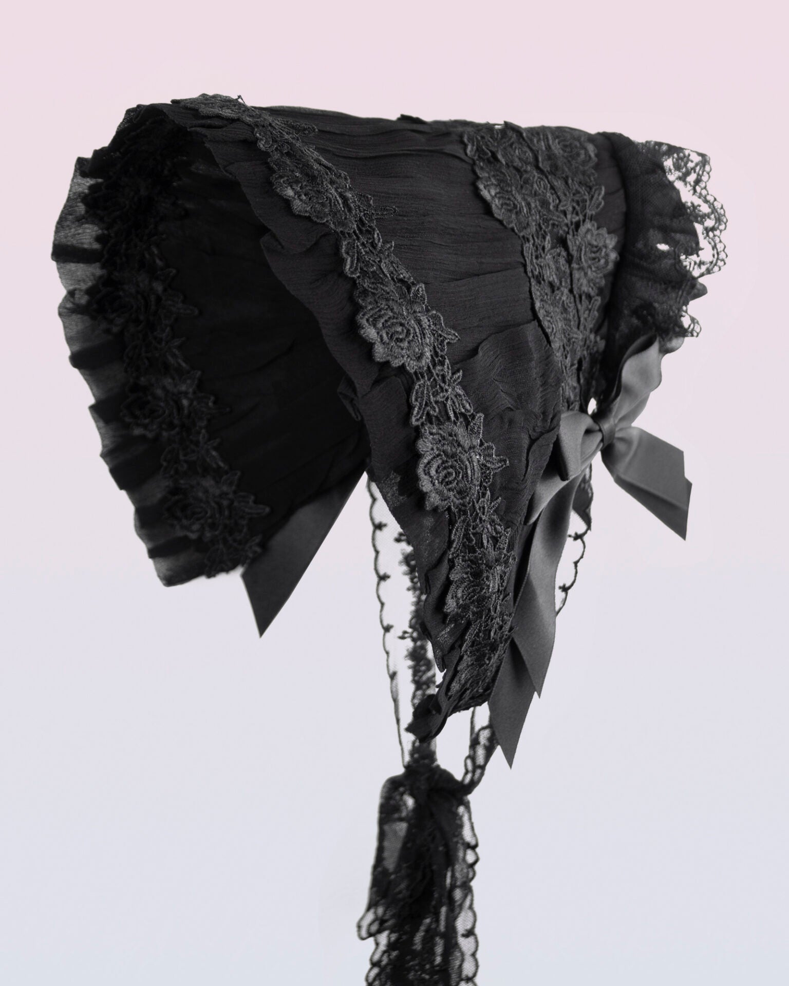 Semitransparent bonnet made from crinkled viscose, decorated with ribbons, rose lace, and bows. Secured to the head with a hair comb.