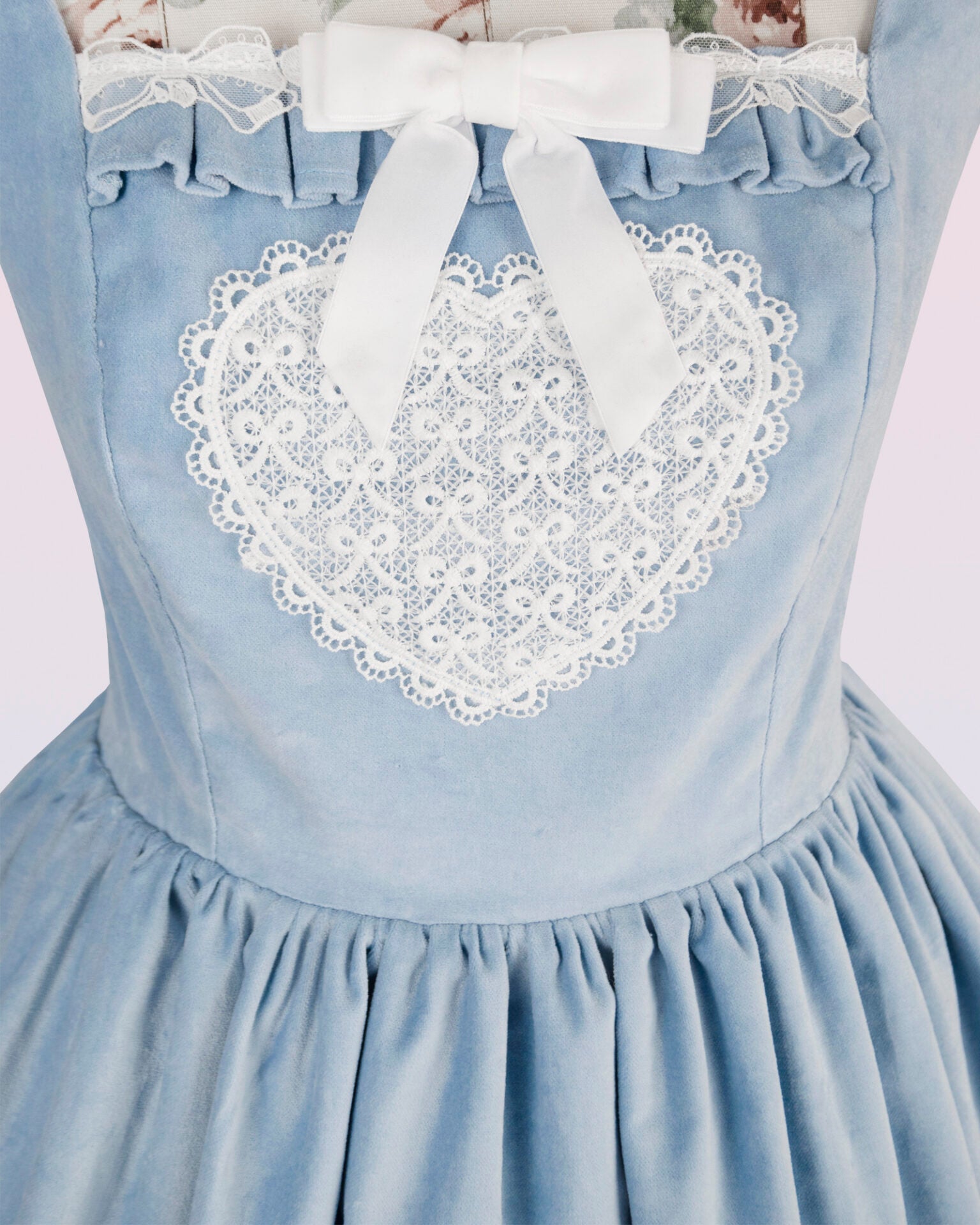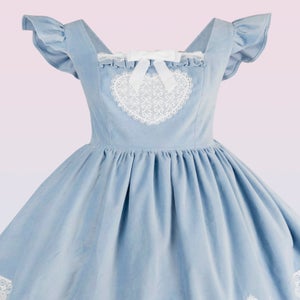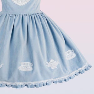 The fitted cotton velvet pinafore dress has an elasticized back for adjustable sizing. The adjustable straps make it suitable for various heights. Decorated with a tea cup, tea pot and heart lace appliques, bow lace trim and a detachable velvet bow.
