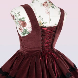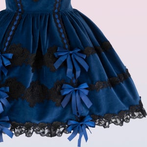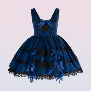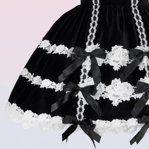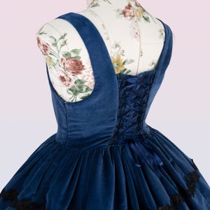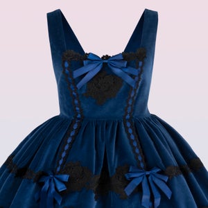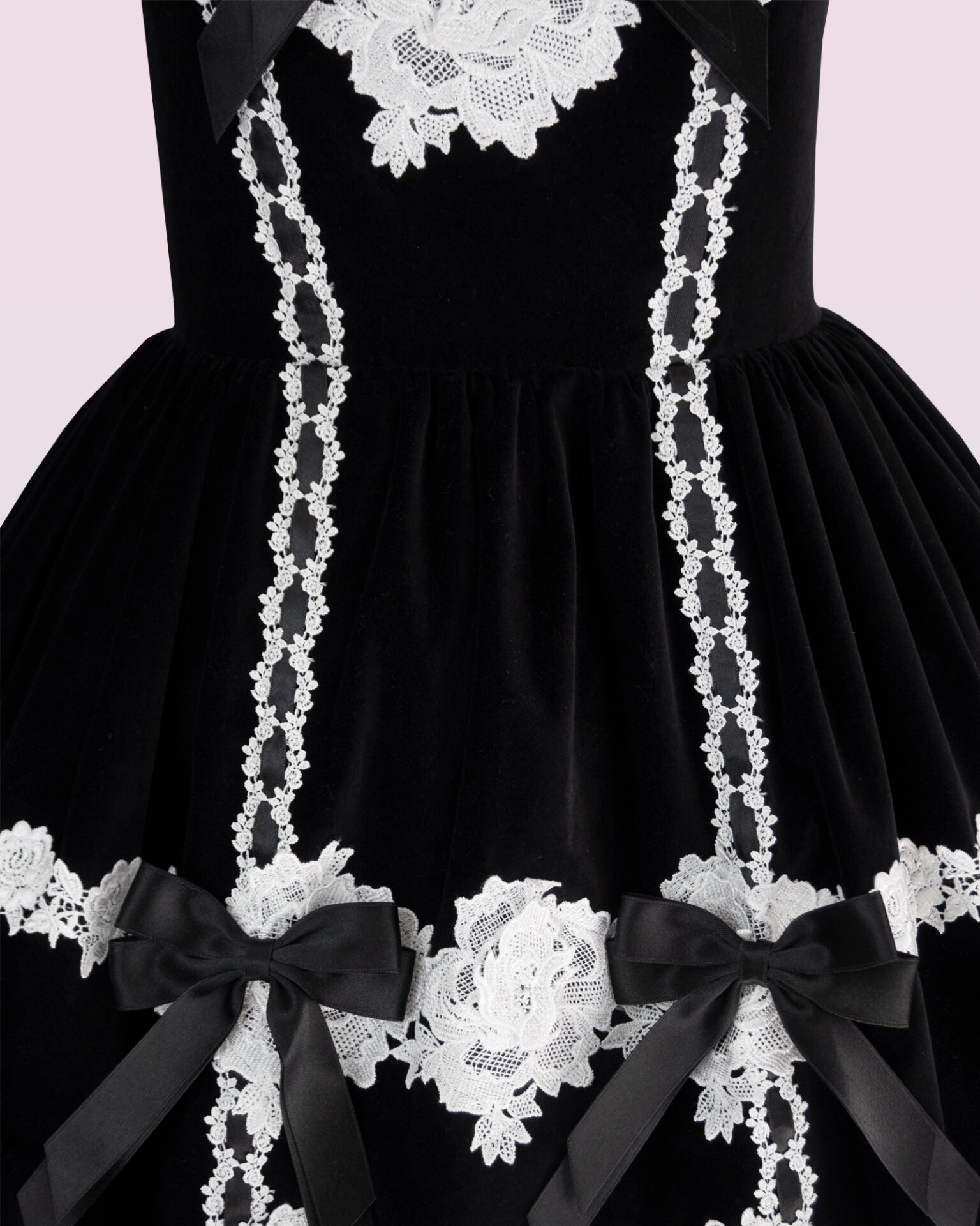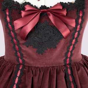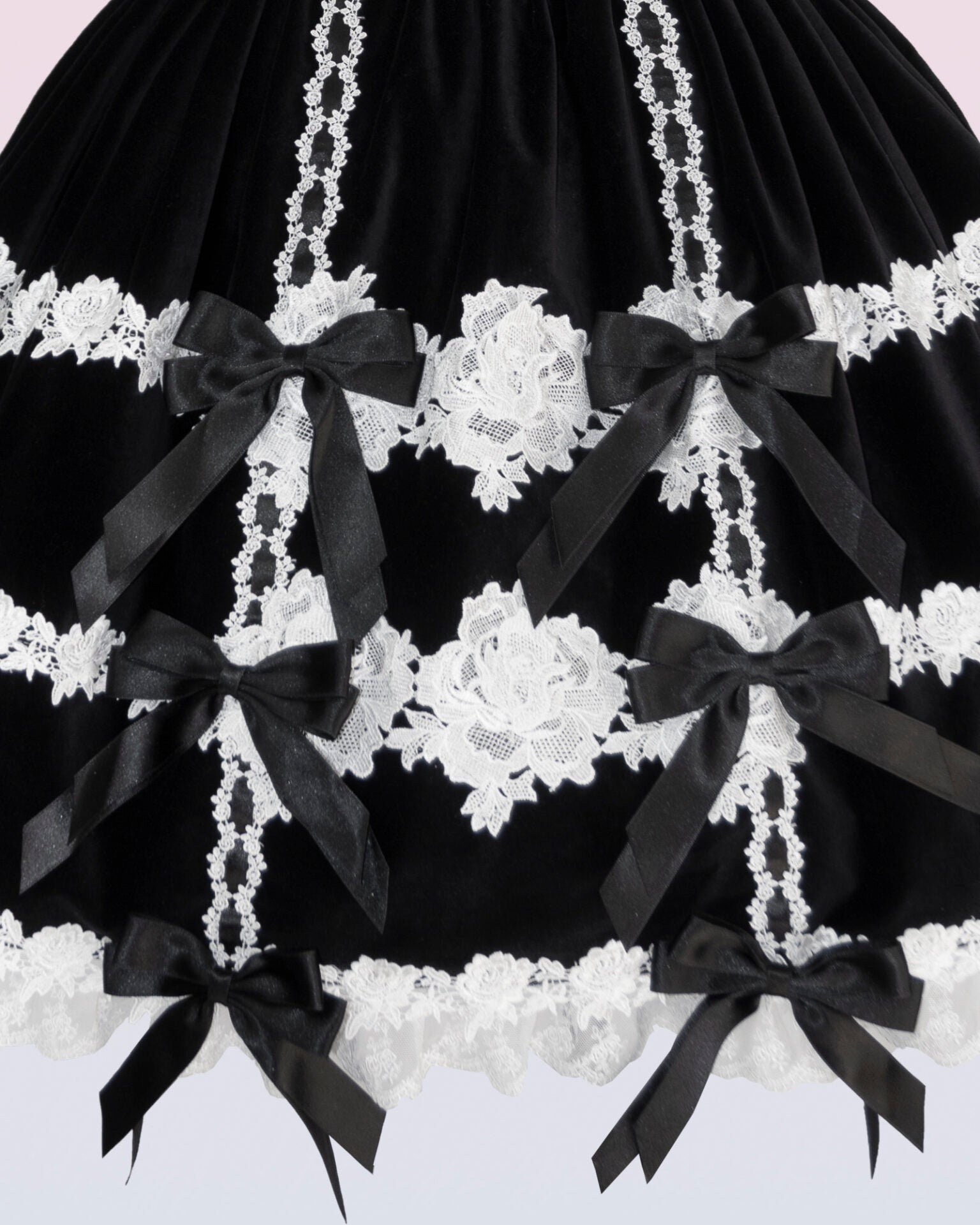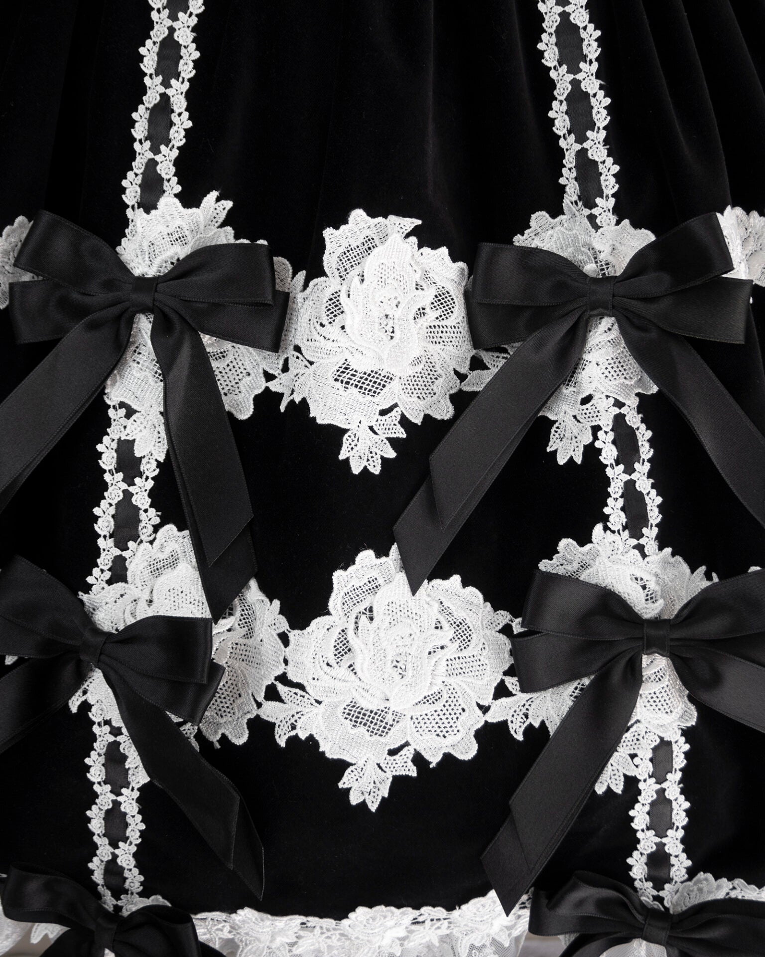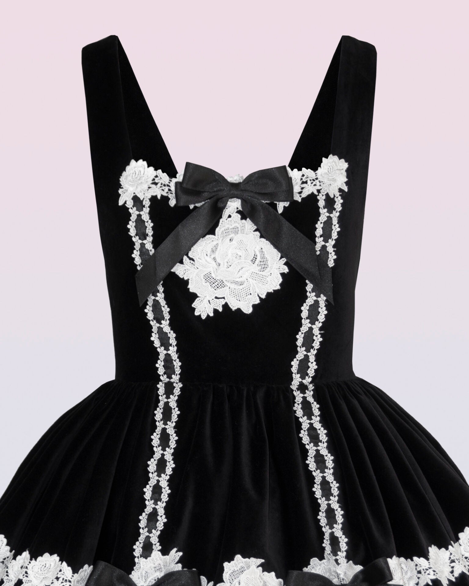 Fitted cotton velvet pinafore dress decorated with vertical lace layers and ribbons, horizontal lace trims along the neckline, three lace tiers on the skirt, rose lace appliqués on the bodice and skirt, and seven detachable satin bows. Features a side zipper, in-seam pockets, and back bodice lacing with elastic for an adjustable fit. You can choose between black and white lace for each colour.