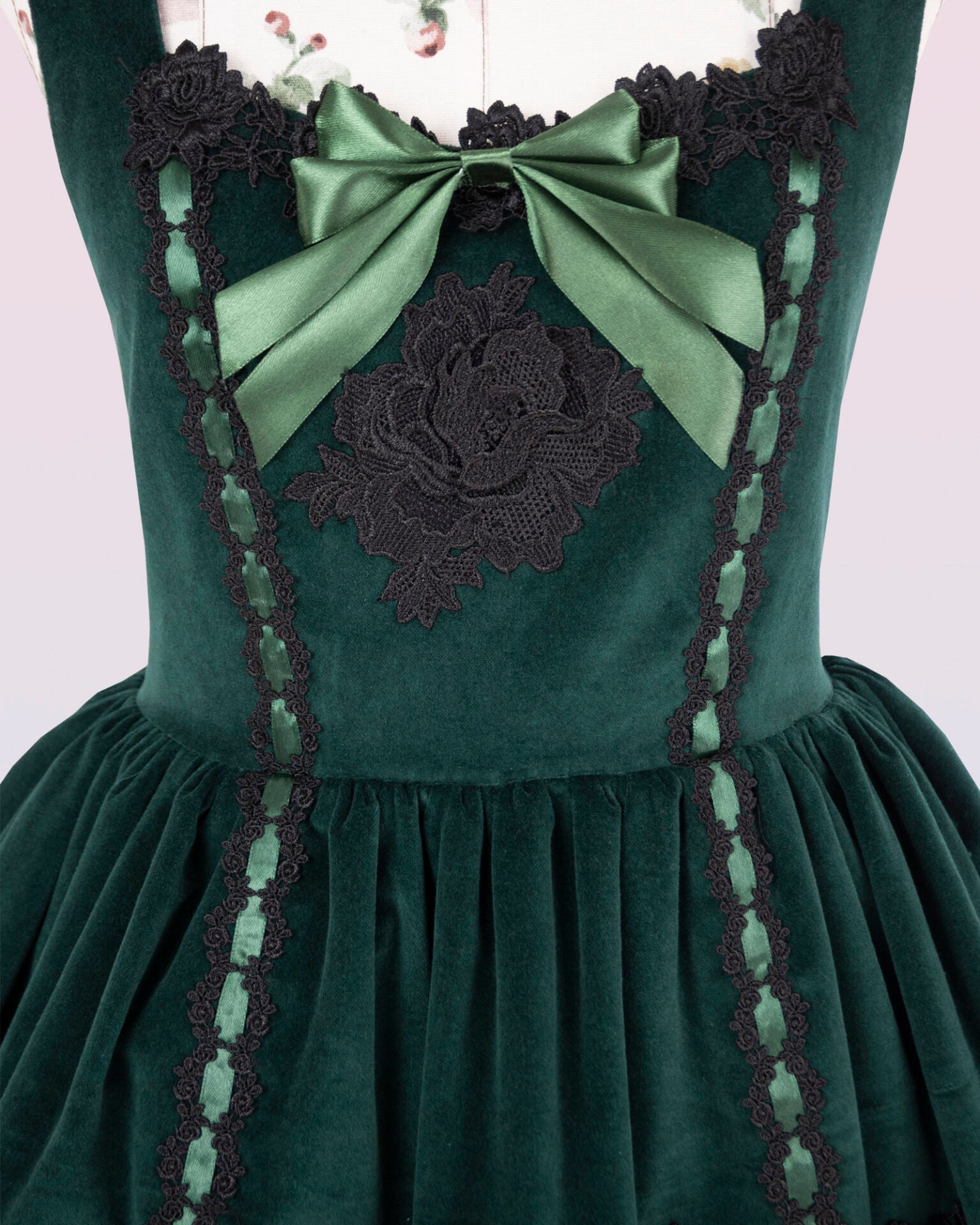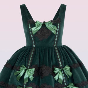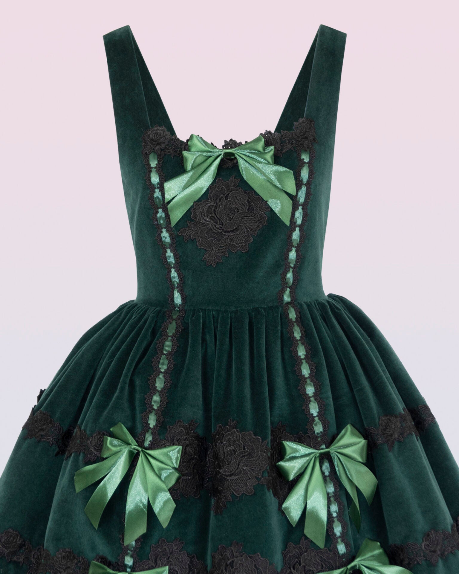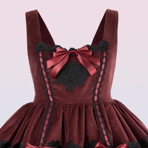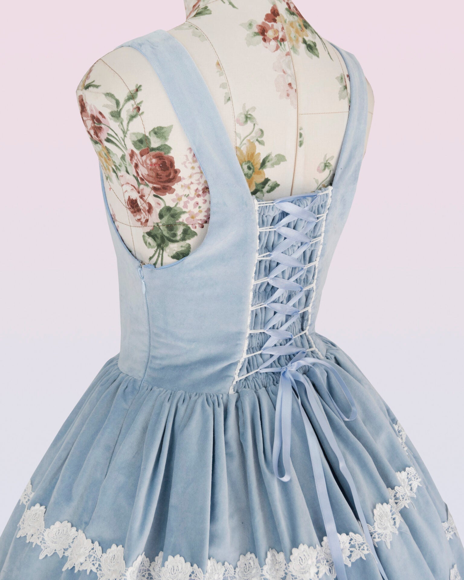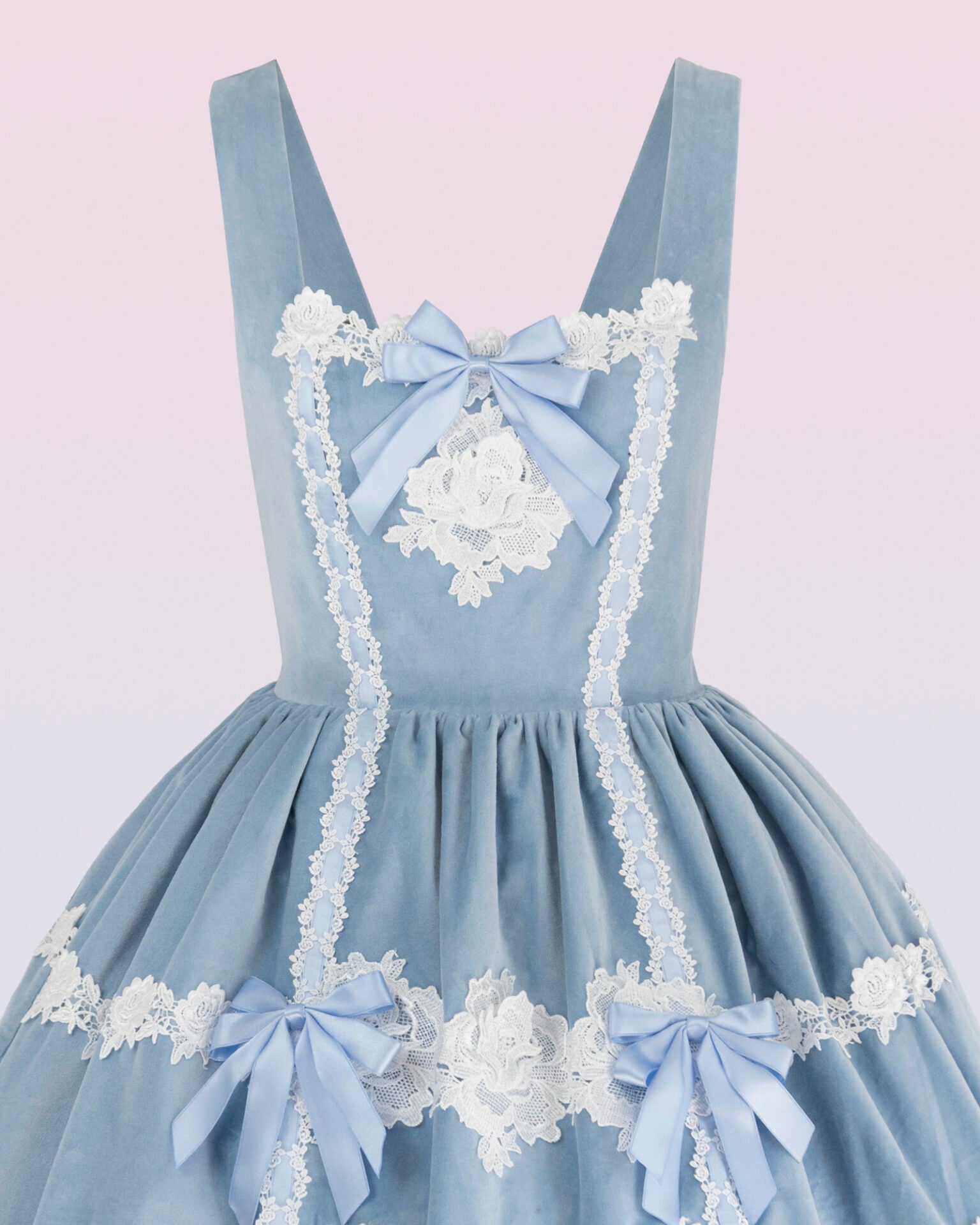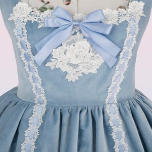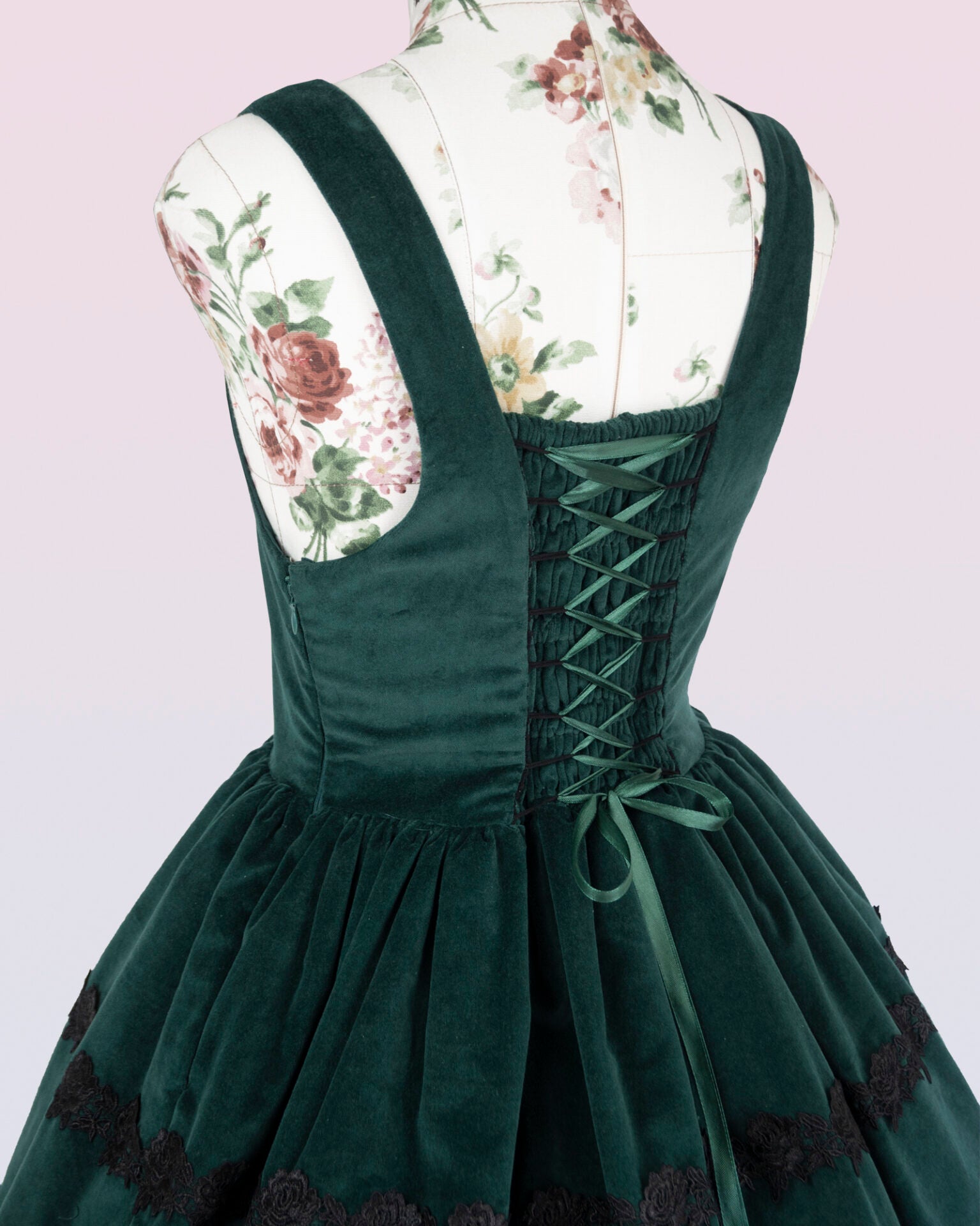 Fitted cotton velvet pinafore dress decorated with vertical lace layers and ribbons, horizontal lace trims along the neckline, three lace tiers on the skirt, rose lace appliqués on the bodice and skirt, and seven detachable satin bows. Features a side zipper, in-seam pockets, and back bodice lacing with elastic for an adjustable fit. You can choose between black and white lace for each colour.
