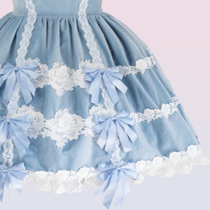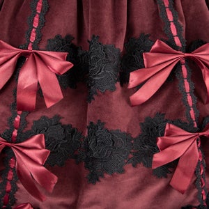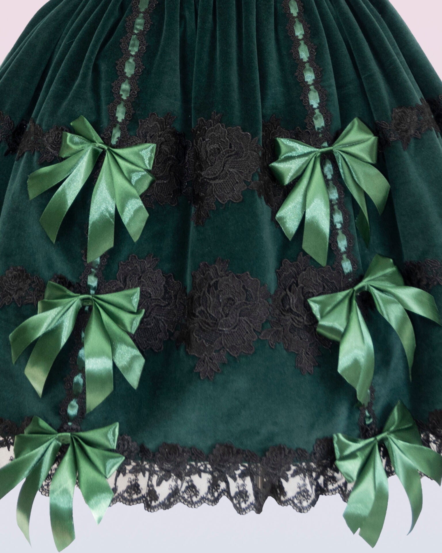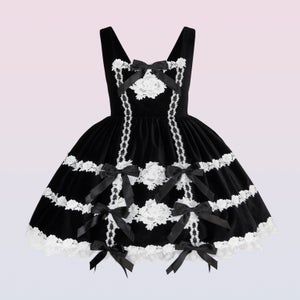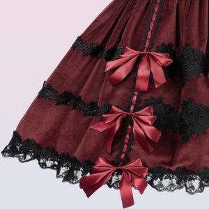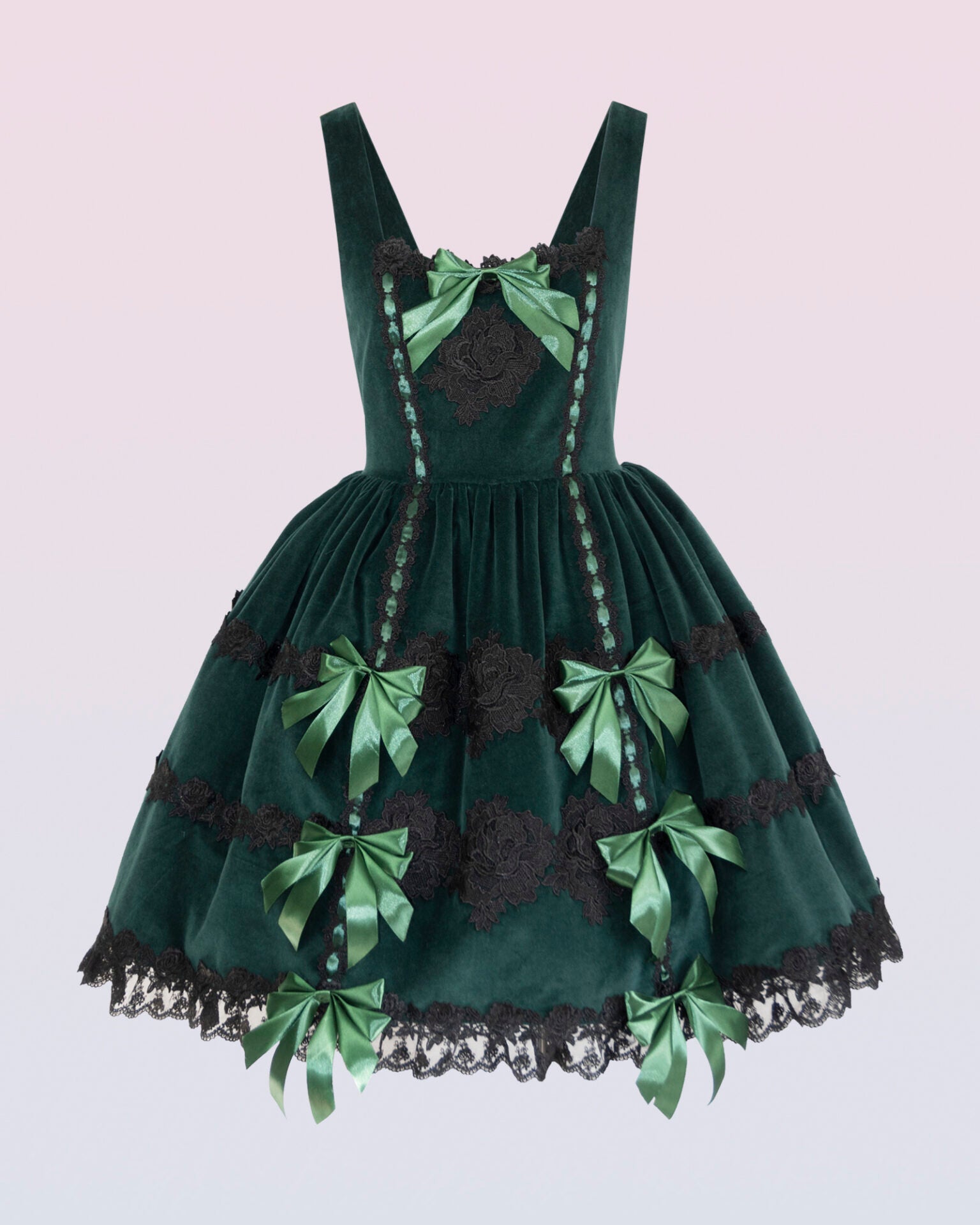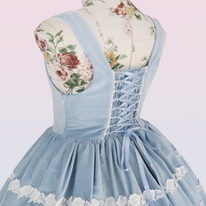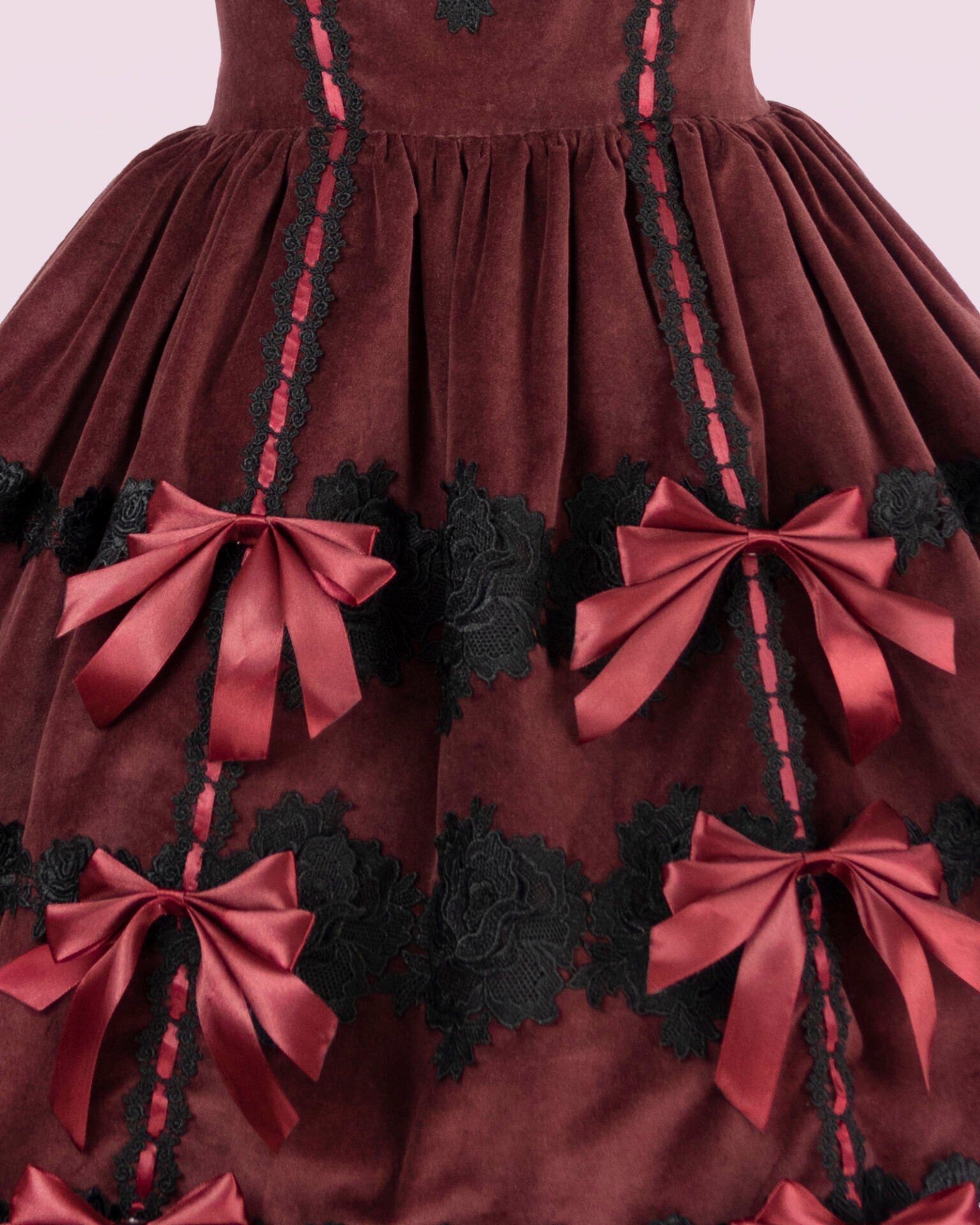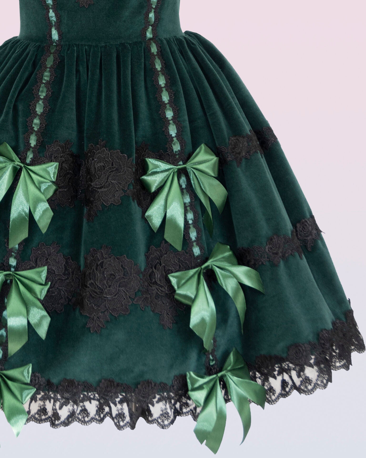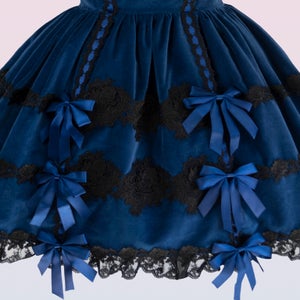 Fitted cotton velvet pinafore dress decorated with vertical lace layers and ribbons, horizontal lace trims along the neckline, three lace tiers on the skirt, rose lace appliqués on the bodice and skirt, and seven detachable satin bows. Features a side zipper, in-seam pockets, and back bodice lacing with elastic for an adjustable fit. You can choose between black and white lace for each colour.