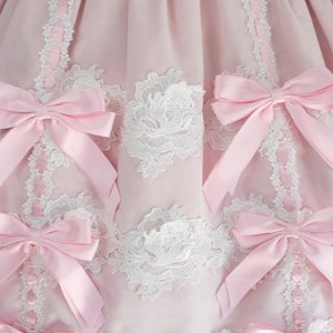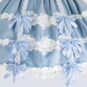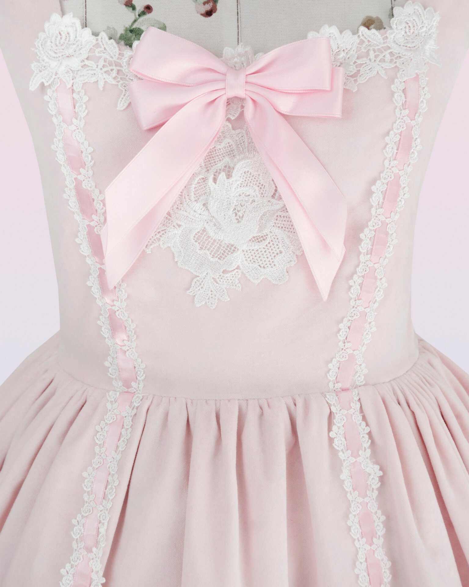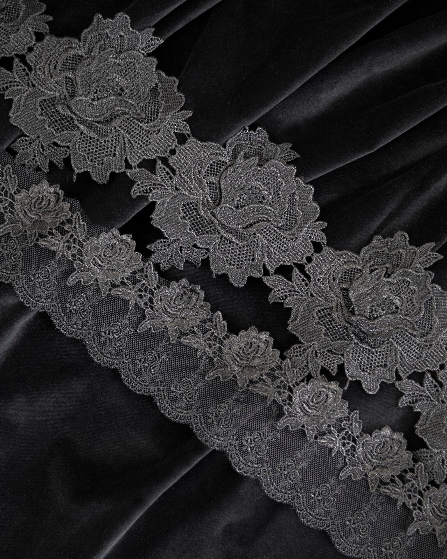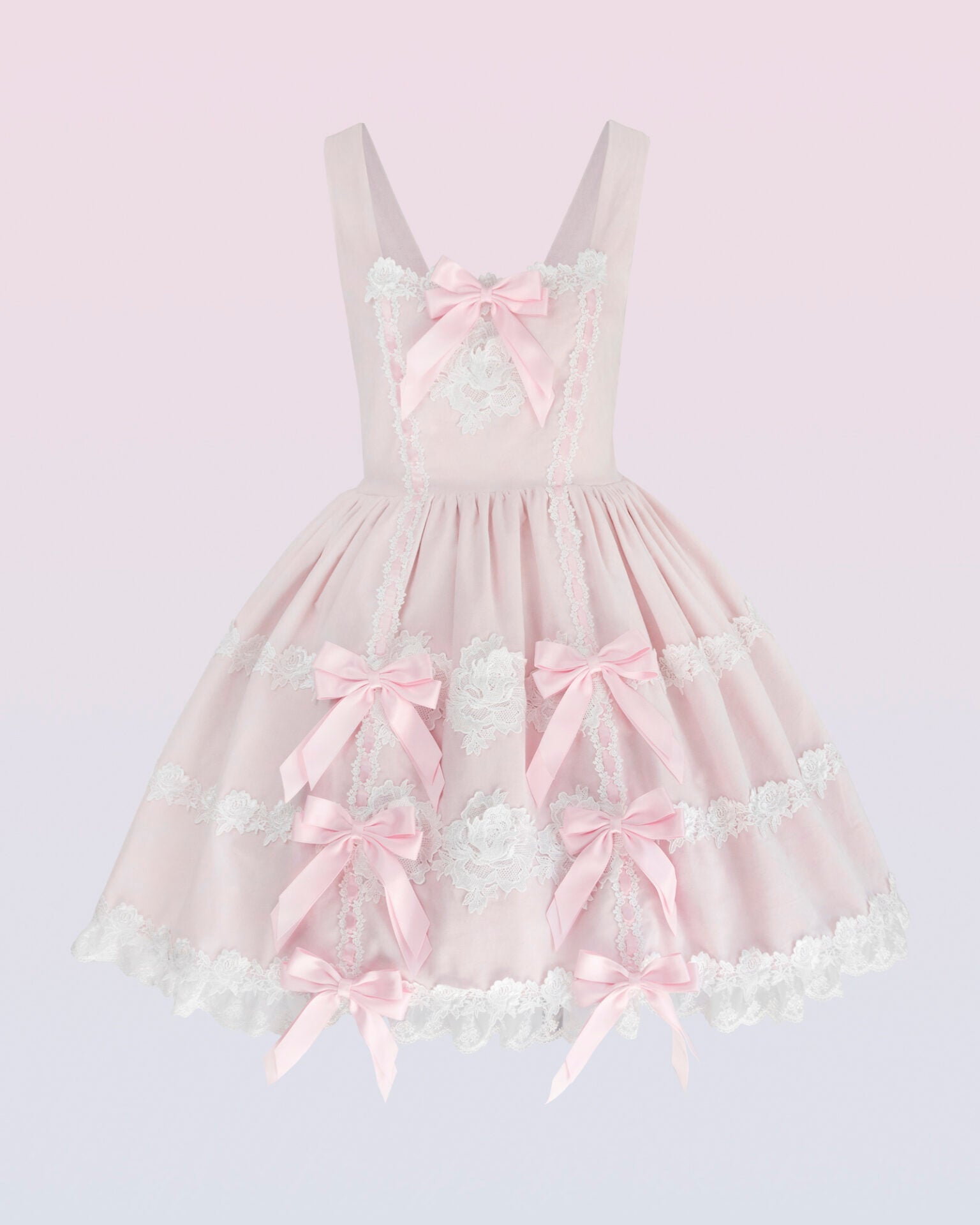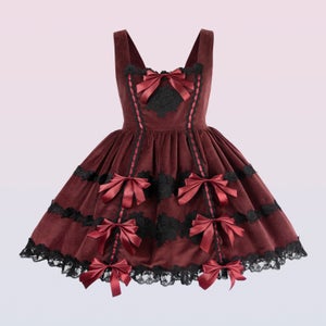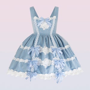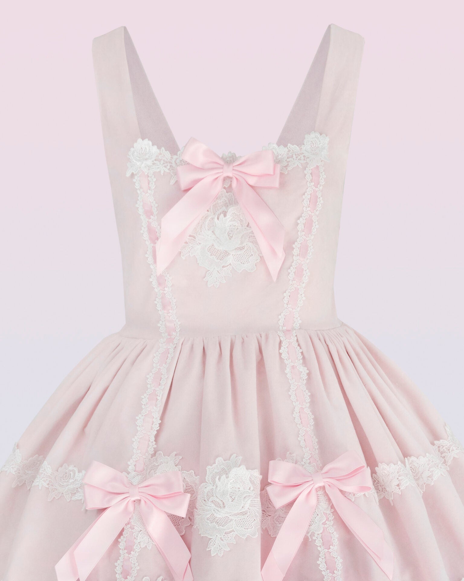 Fitted cotton velvet pinafore dress decorated with vertical lace layers and ribbons, horizontal lace trims along the neckline, three lace tiers on the skirt, rose lace appliqués on the bodice and skirt, and seven detachable satin bows. Features a side zipper, in-seam pockets, and back bodice lacing with elastic for an adjustable fit. You can choose between black and white lace for each colour.