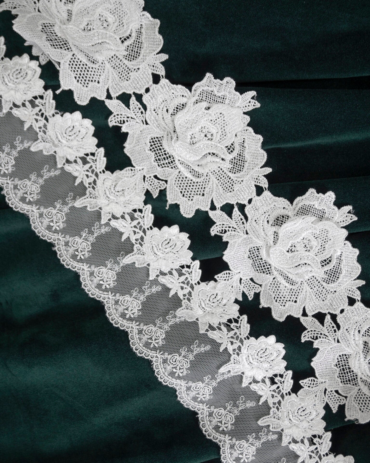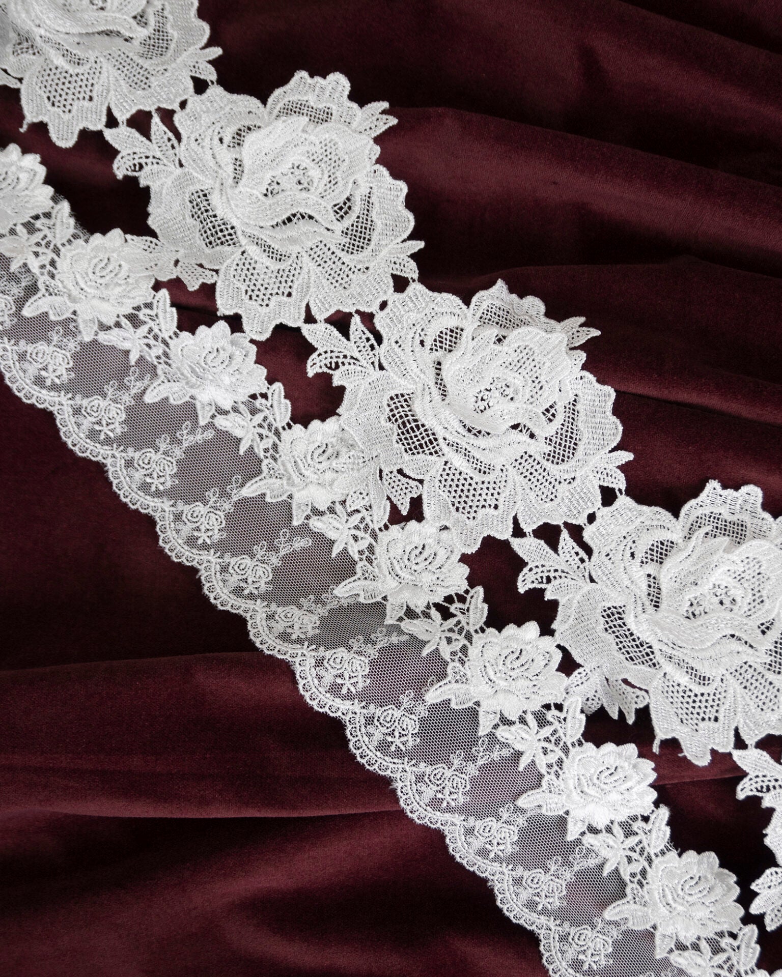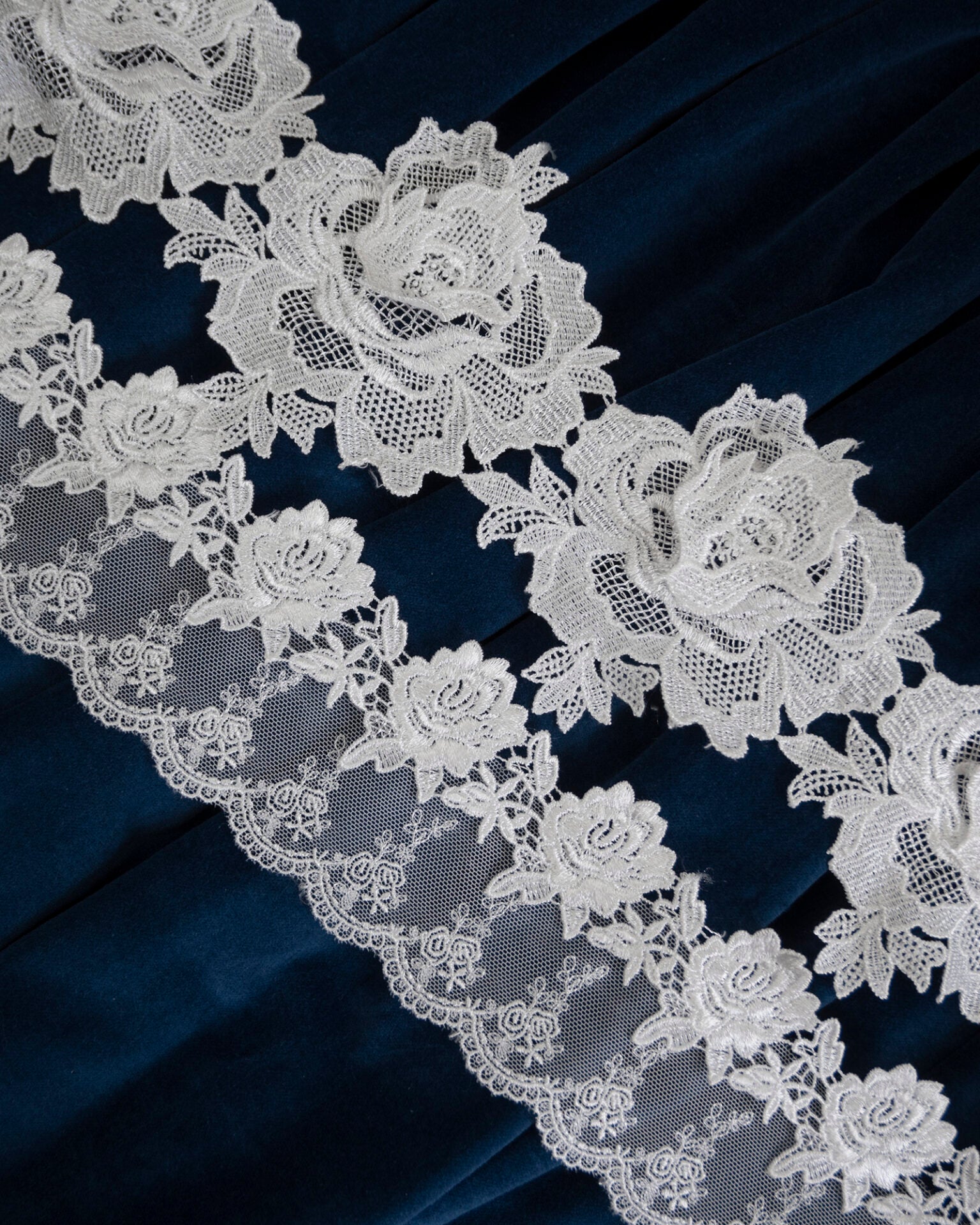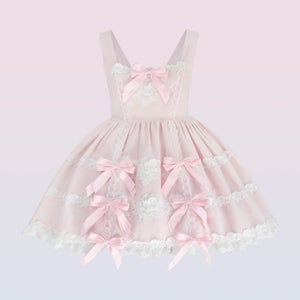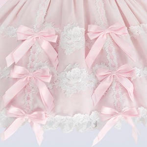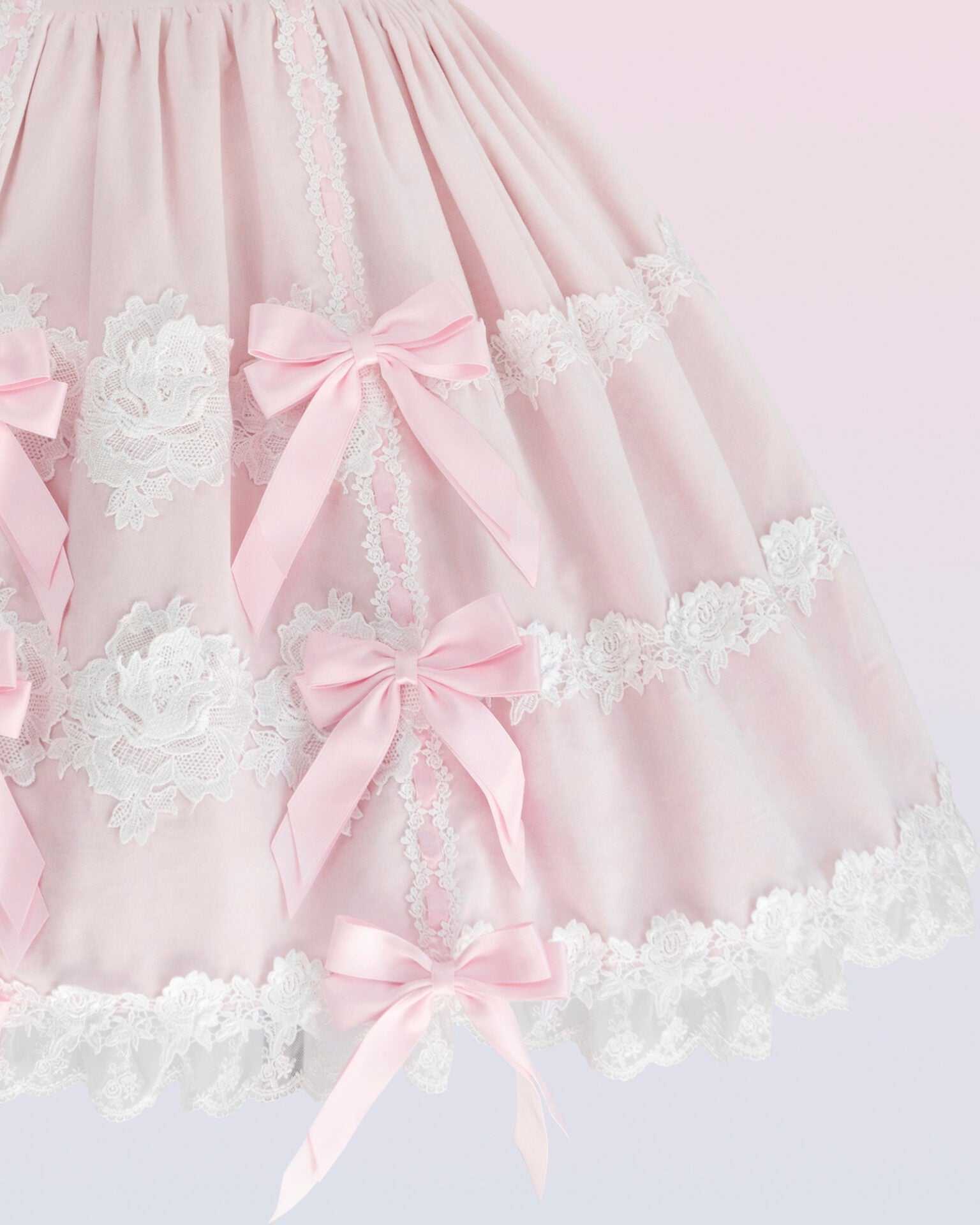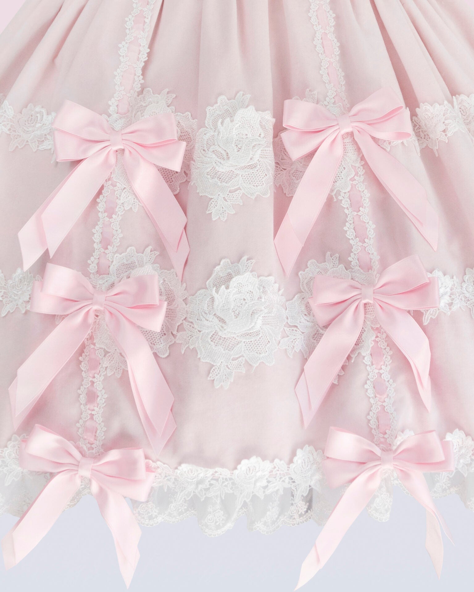 Fitted cotton velvet pinafore dress decorated with vertical lace layers and ribbons, horizontal lace trims along the neckline, three lace tiers on the skirt, rose lace appliqués on the bodice and skirt, and seven detachable satin bows. Features a side zipper, in-seam pockets, and back bodice lacing with elastic for an adjustable fit. You can choose between black and white lace for each colour.