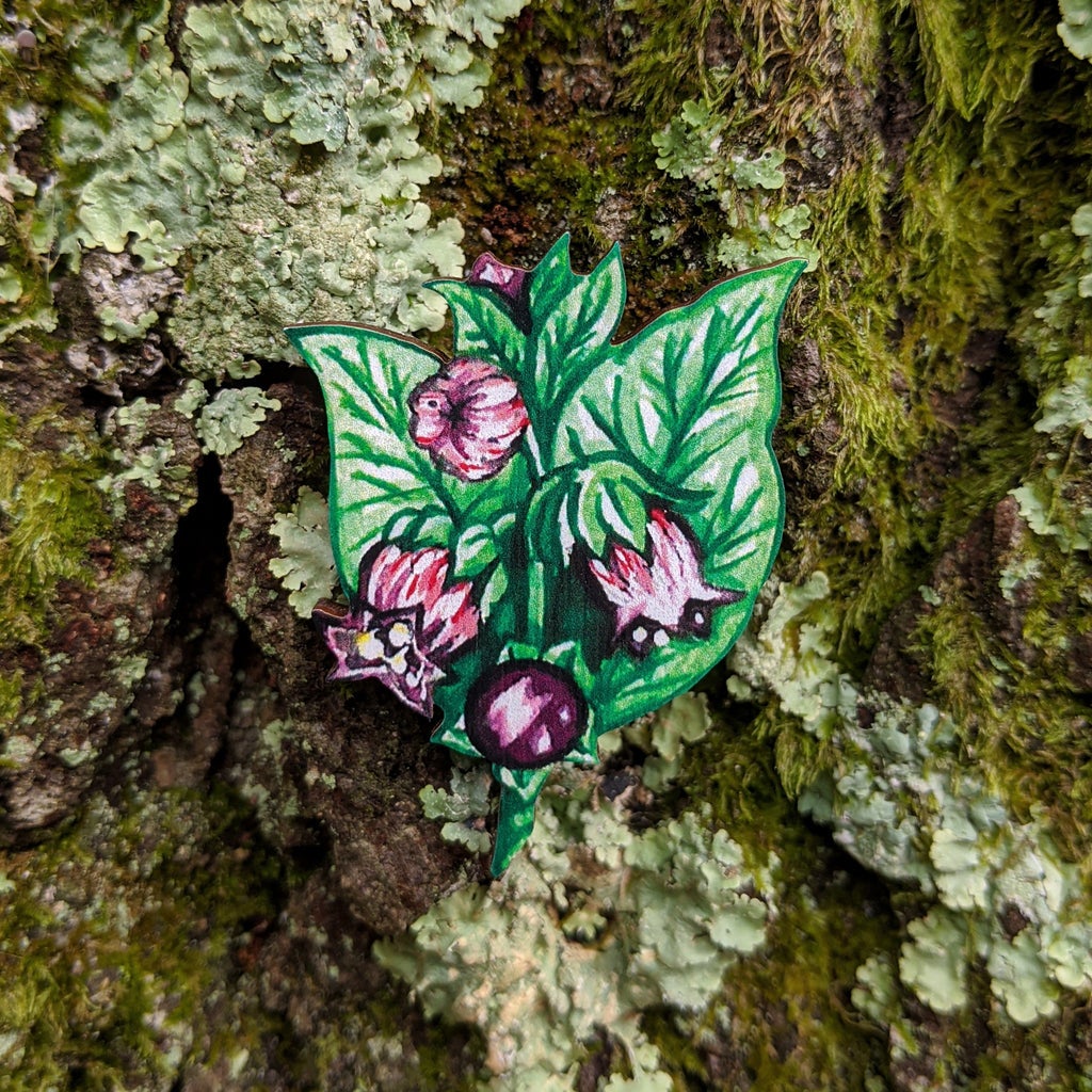 "Poisonous and fascinating this brooch features a sprig of deadly nightshade digitally printed on wood.